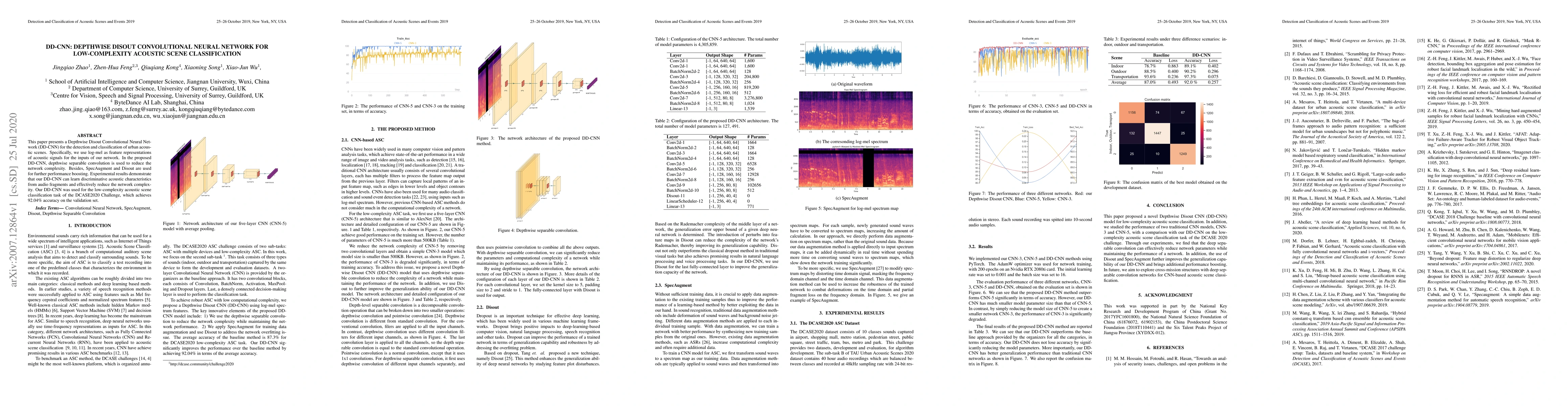 This paper presents a Depthwise Disout Convolutional Neural Network (DD-CNN) for the detection and classification of urban acoustic scenes. Specifically, we use log-mel as feature representations of acoustic signals for the inputs of our network. In the proposed DD-CNN, depthwise separable convolution is used to reduce the network complexity. Besides, SpecAugment and Disout are used for further performance boosting. Experimental results demonstrate that our DD-CNN can learn discriminative acoustic characteristics from audio fragments and effectively reduce the network complexity. Our DD-CNN was used for the low-complexity acoustic scene classification task of the DCASE2020 Challenge, which achieves 92.04% accuracy on the validation set.