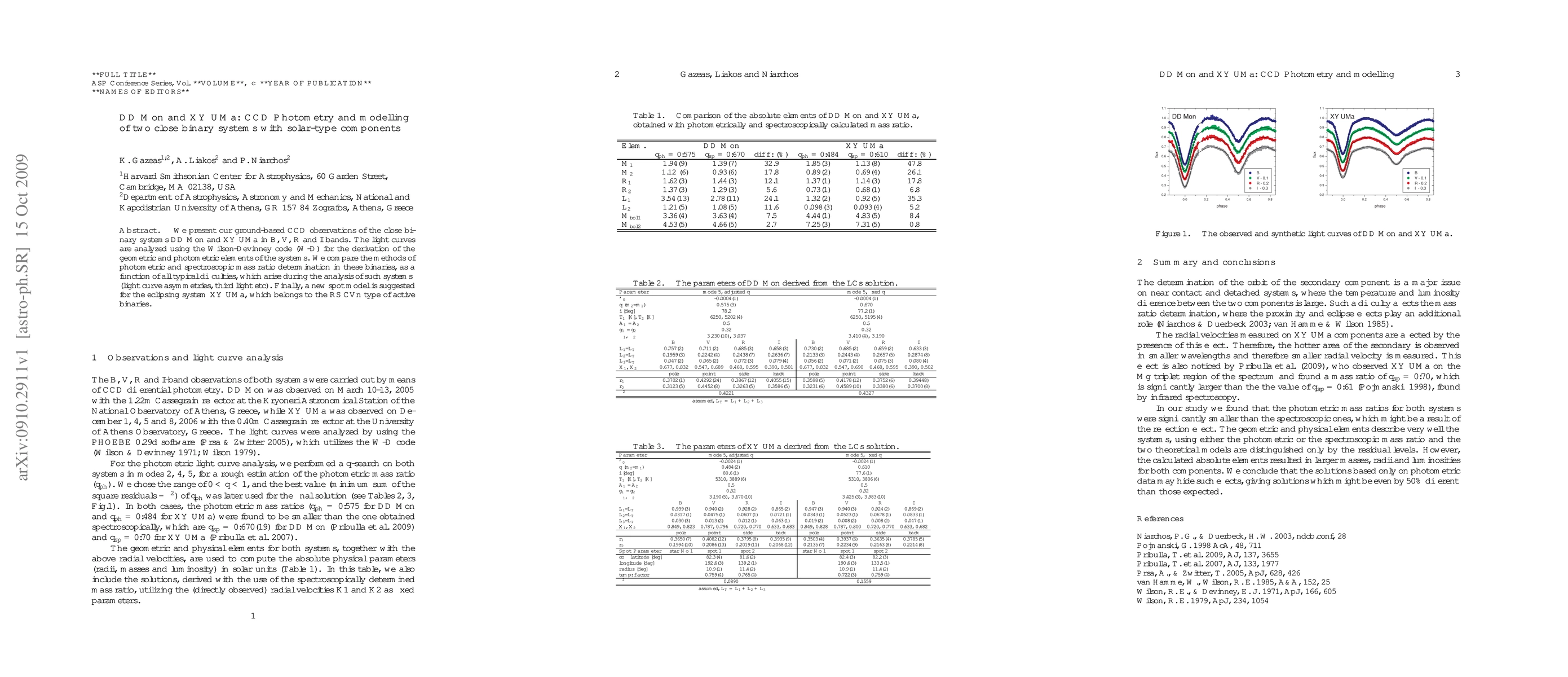 We present our ground-based CCD observations of the close binary systems DD Mon and XY UMa in B, V, R and I bands. The light curves are analyzed using the Wilson-Devinney code (W-D) for the derivation of the geometric and photometric elements of the systems. We compare the methods of photometric and spectroscopic mass ratio determination in these binaries, as a function of all typical difficulties, which arise during the analysis of such systems (light curve asymmetries, third light etc). Finally, a new spot model is suggested for the eclipsing system XY UMa, which belongs to the RS CVn type of active binaries.