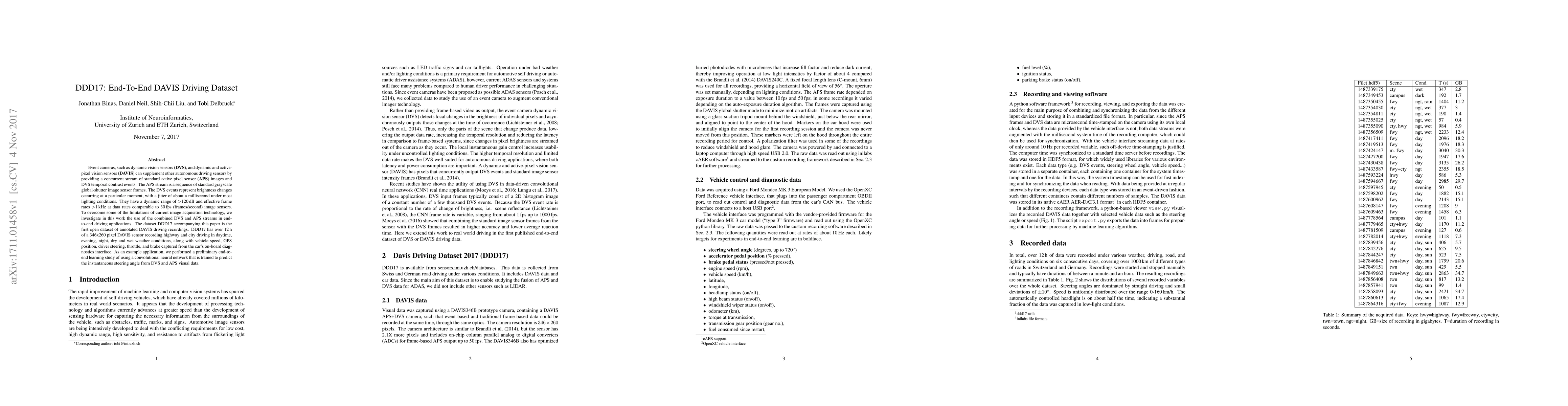 This research paper introduces the DDD17 dataset, a comprehensive collection of annotated driving recordings featuring dynamic vision sensor (DVS) and active-pixel sensor (APS) data, aiming to improve end-to-end autonomous driving applications with augmented visual data.