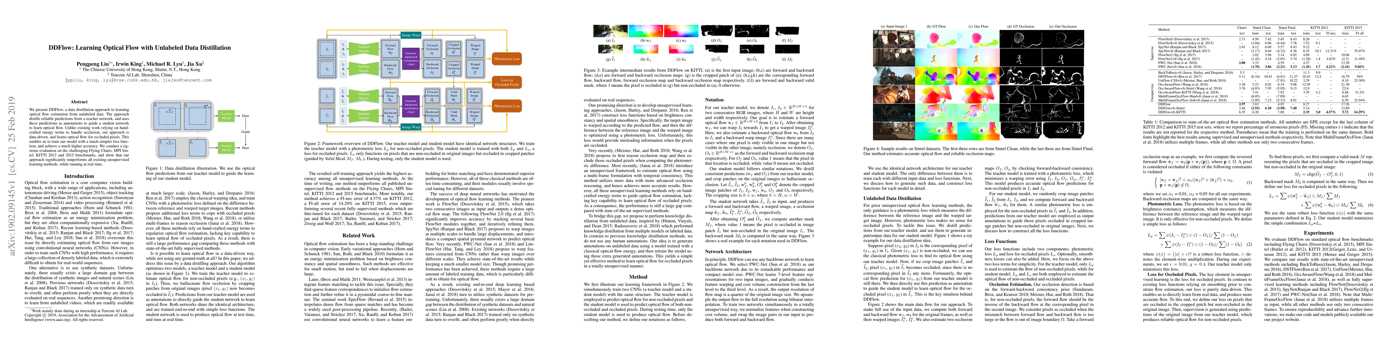 This paper introduces DDFlow, a method that uses data distillation to learn optical flow from unlabeled data, achieving real-time performance and outperforming existing unsupervised methods on benchmark datasets.