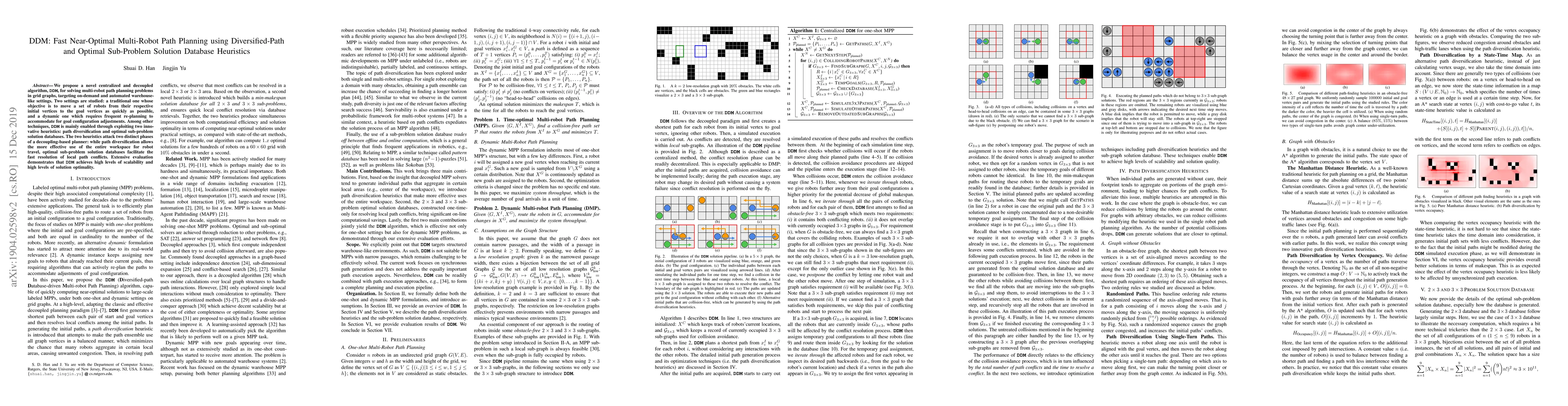 The DDM algorithm presents a novel centralized approach for multi-robot path planning in grid graphs, utilizing path diversification and optimal sub-problem solution databases to enhance scalability and solution optimality. The method effectively handles both static and dynamic environments, achieving near-optimal performance through innovative heuristics.