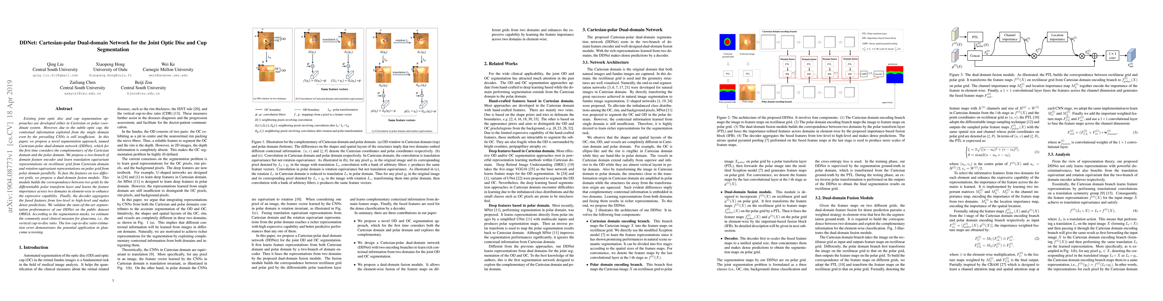DDNet introduces a novel Cartesian-polar dual-domain network for joint optic disc and cup segmentation, leveraging complementary features from both domains to enhance contextual information. The approach achieves state-of-the-art performance on ORIGA dataset and shows potential for glaucoma screening through accurate vertical cup-to-disc ratio estimation.