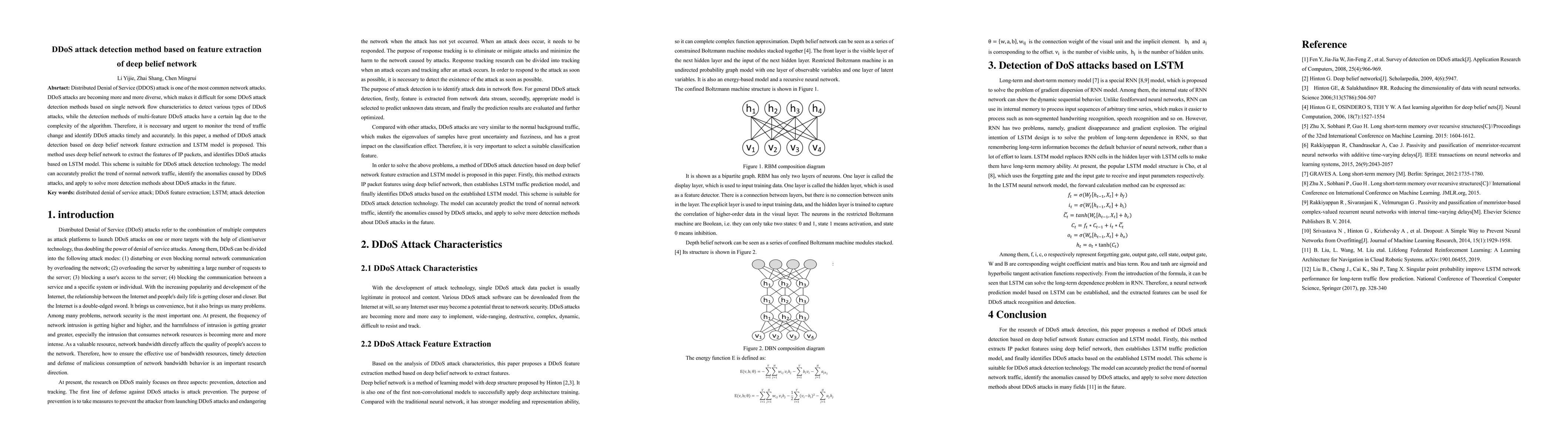 A method of DDoS attack detection based on deep belief network feature extraction and LSTM model is proposed.