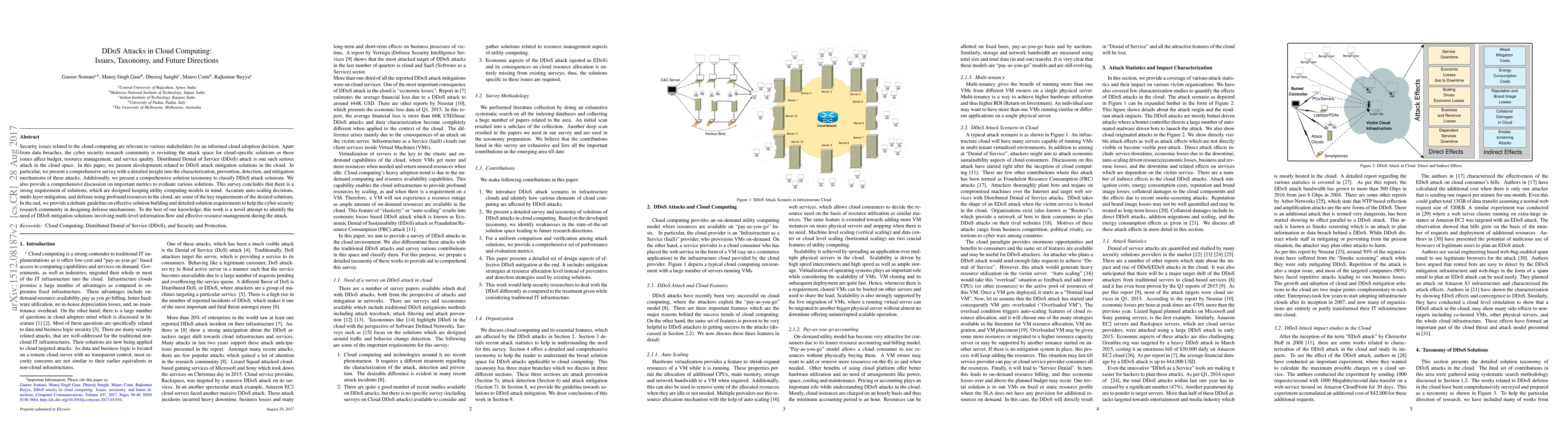 This paper surveys DDoS attack mitigation strategies in cloud computing, detailing characterization, prevention, detection, and mitigation mechanisms. It proposes a taxonomy for classifying these solutions and emphasizes the need for auto-scaling, multi-layer defenses, and resource management to address cloud-specific challenges.