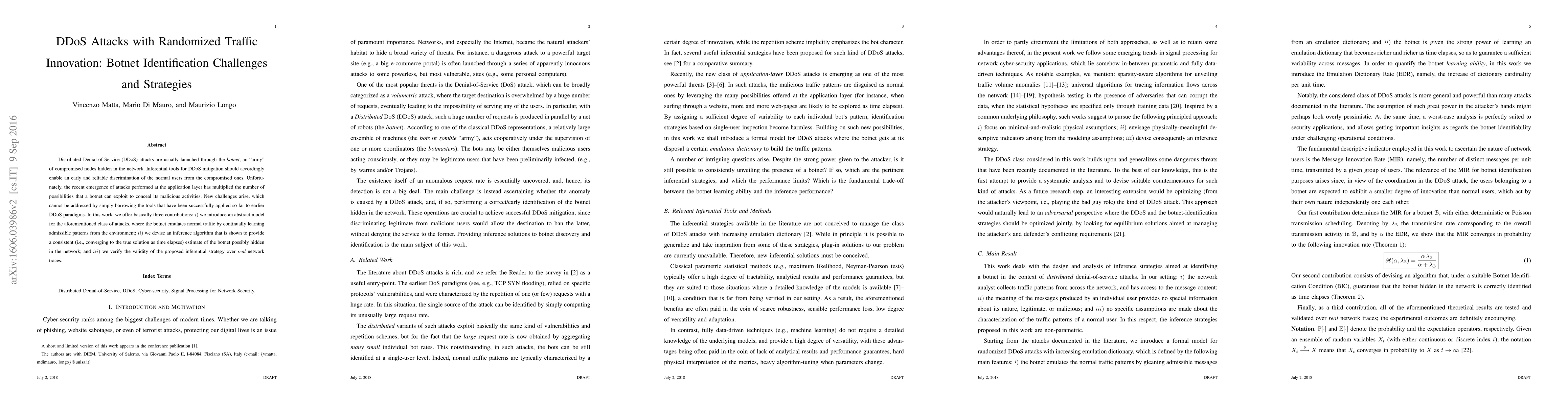 This paper introduces a model for detecting botnets in DDoS attacks that use randomized traffic to hide malicious activities. It proposes an inference algorithm that reliably distinguishes compromised nodes from normal users and validates the method using real network data.