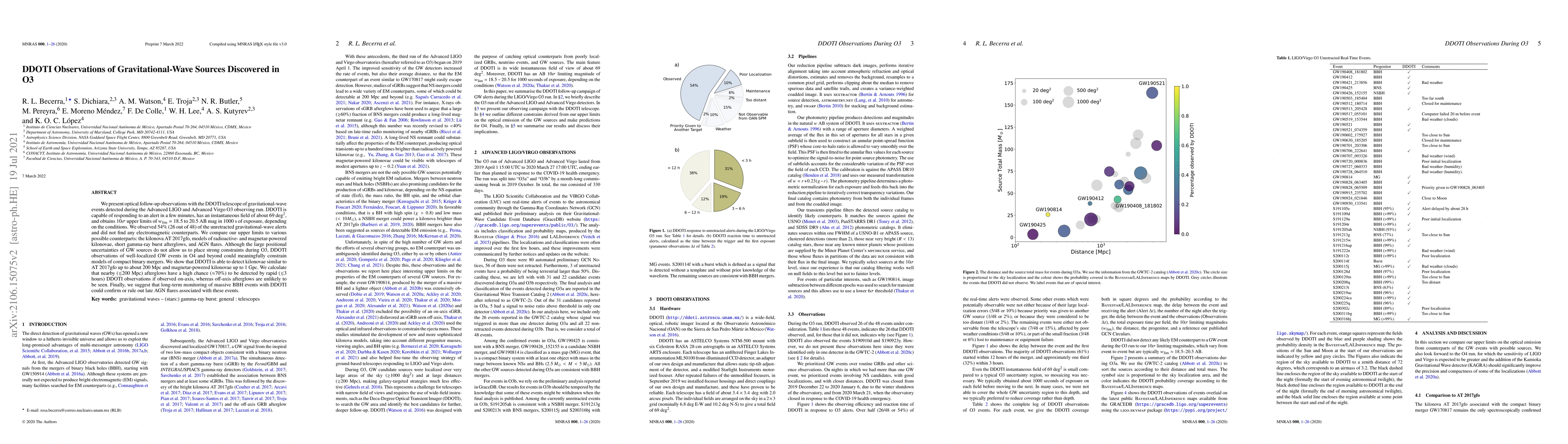 We present optical follow-up observations with the DDOTI telescope of gravitational-wave events detected during the Advanced LIGO and Advanced Virgo O3 observing run. DDOTI is capable of responding to an alert in a few minutes, has an instantaneous field of about 69 deg$^{2}$, and obtains $10\sigma$ upper limits of $w_{\rm lim}=18.5$ to 20.5 AB mag in 1000~s of exposure, depending on the conditions. We observed 54\% (26 out of 48) of the unretracted gravitational-wave alerts and did not find any electromagnetic counterparts. We compare our upper limits to various possible counterparts: the kilonova AT~2017gfo, models of radioactive- and magnetar-powered kilonovae, short gamma-ray burst afterglows, and AGN flares. Although the large positional uncertainties of GW sources do not allow us to place strong constraints during O3, DDOTI observations of well-localized GW events in O4 and beyond could meaningfully constrain models of compact binary mergers. We show that DDOTI is able to detect kilonovae similar to AT~2017gfo up to about 200~Mpc and magnetar-powered kilonovae up to 1~Gpc. We calculate that nearby ($\lesssim$200 Mpc) afterglows have a high chance ($\approx$70\%) to be detected by rapid ($\lesssim$3 hours) DDOTI observations if observed on-axis, whereas off-axis afterglows are unlikely to be seen. Finally, we suggest that long-term monitoring of massive BBH events with DDOTI could confirm or rule out late AGN flares associated with these events.