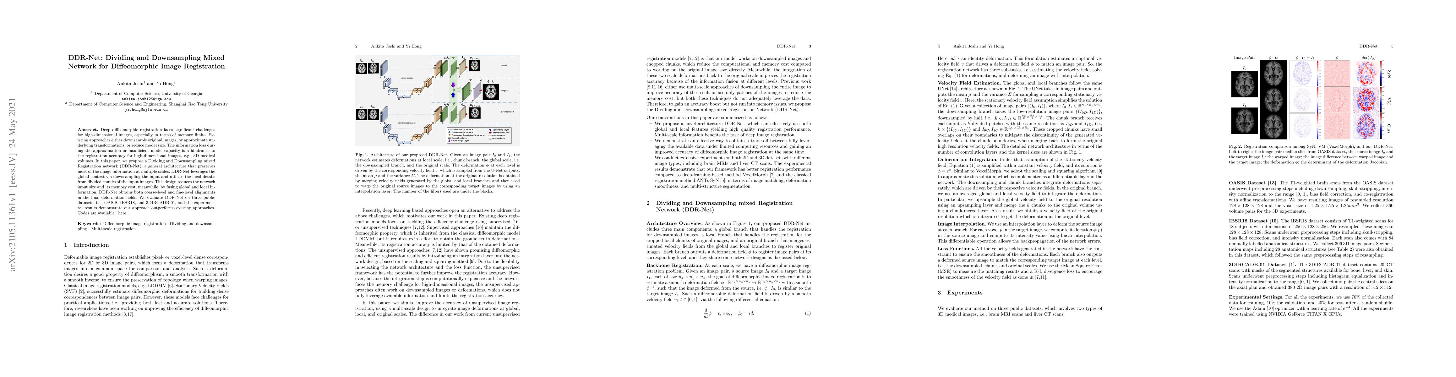 DDR-Net proposes a novel dividing and downsampling mixed network for diffeomorphic image registration, addressing high-dimensional image challenges by preserving information across multiple scales and fusing global and local details. Experimental results show DDR-Net outperforms existing methods on three public datasets.