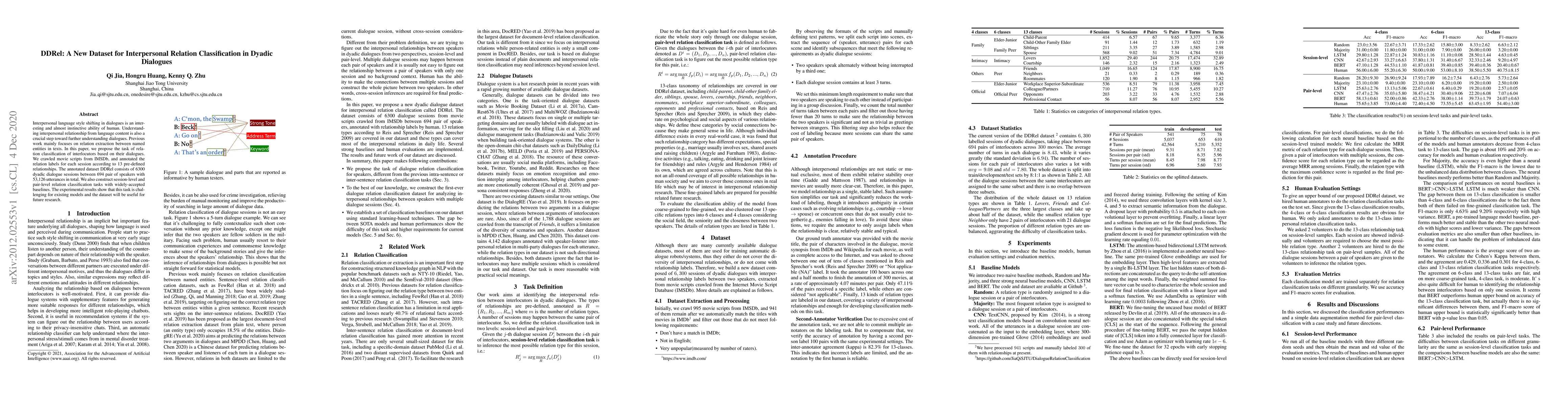 The DDRel dataset introduces a new task for classifying interpersonal relations in dyadic dialogues, featuring 6300 sessions from movie scripts annotated with 13 predefined relationship labels. The dataset aims to advance research in understanding dialogue dynamics and presents challenges for current models.