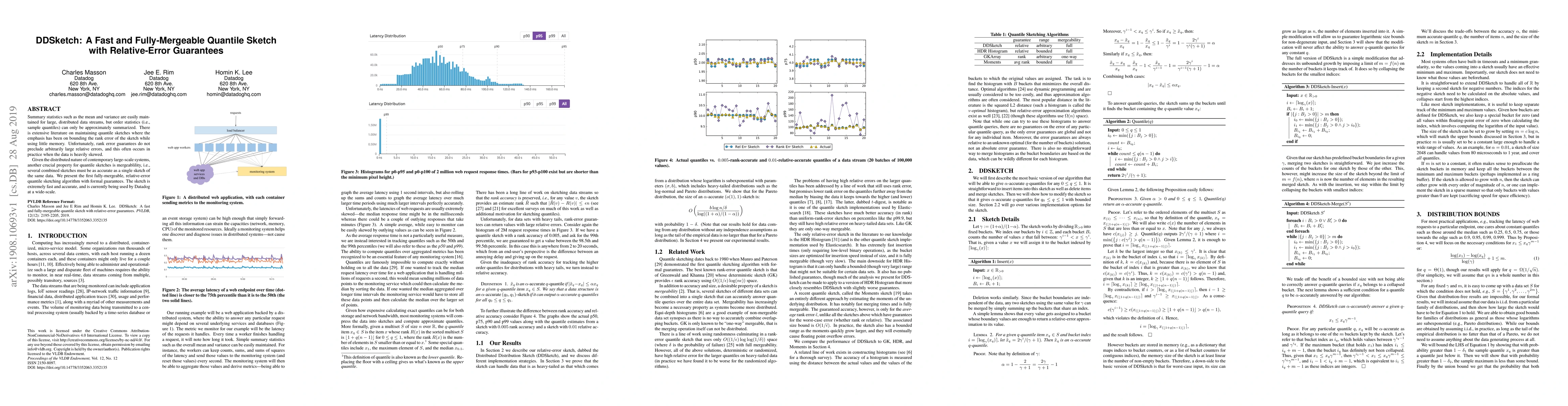 DDSketch is a fast, fully-mergeable quantile sketch that provides relative-error guarantees, addressing the issue of skewed data and improving accuracy over traditional rank-error-based sketches. It is highly efficient and is currently deployed at scale by Datadog.