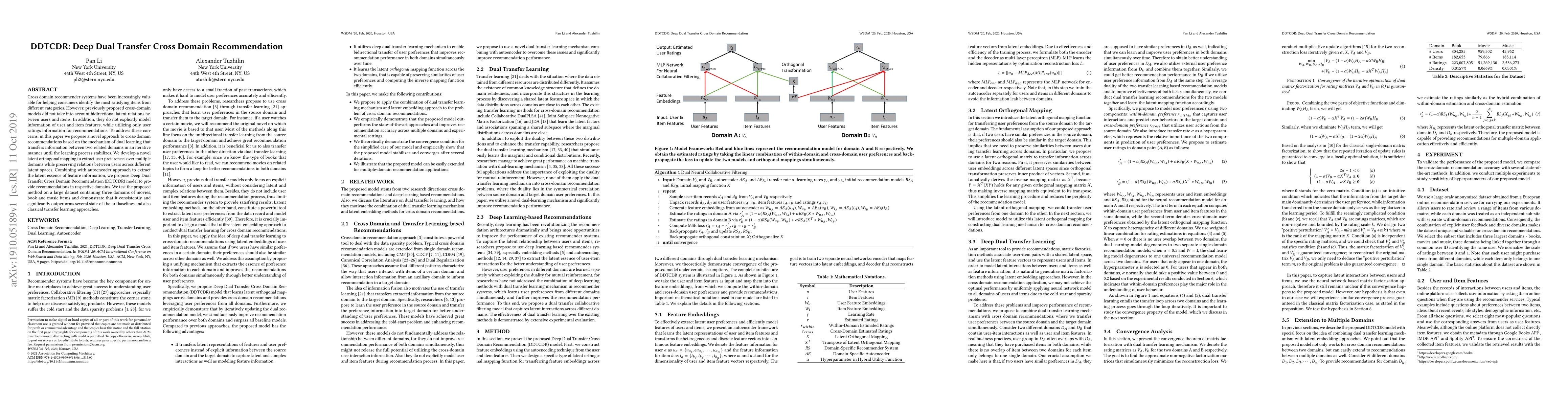The DDTCDR model proposes a dual learning approach for cross-domain recommendation systems that leverages bidirectional latent relations and user/item feature information. It outperforms existing methods on a dataset spanning movies, books, and music, demonstrating significant improvements in recommendation accuracy.