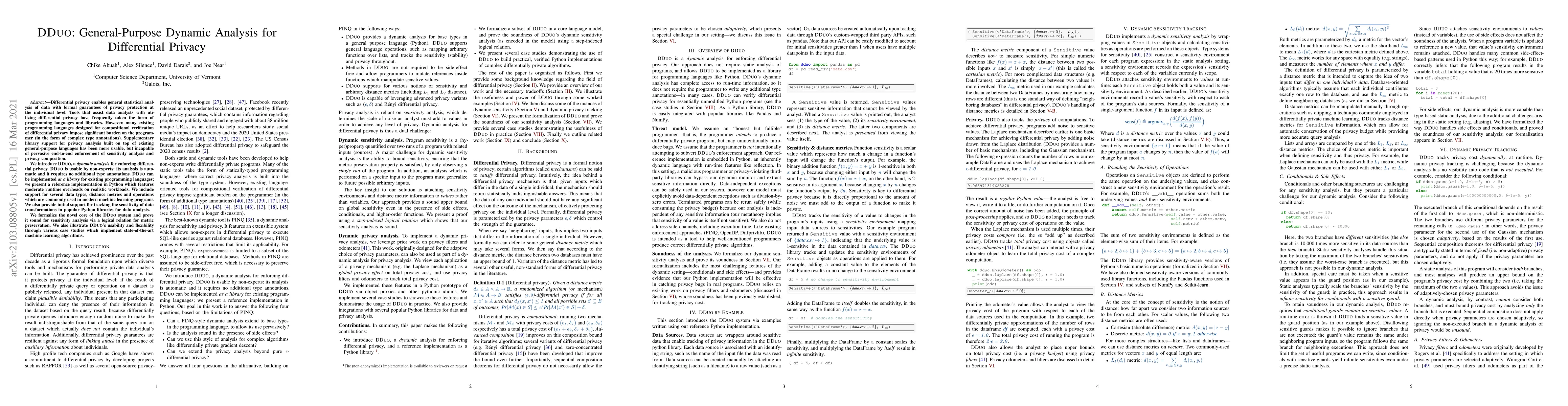DDUO is a dynamic analysis tool for enforcing differential privacy in existing programming languages, requiring no additional type annotations and supporting common data types and operations. It is formally proven sound for sensitivity analysis and demonstrated through case studies of modern machine learning algorithms.