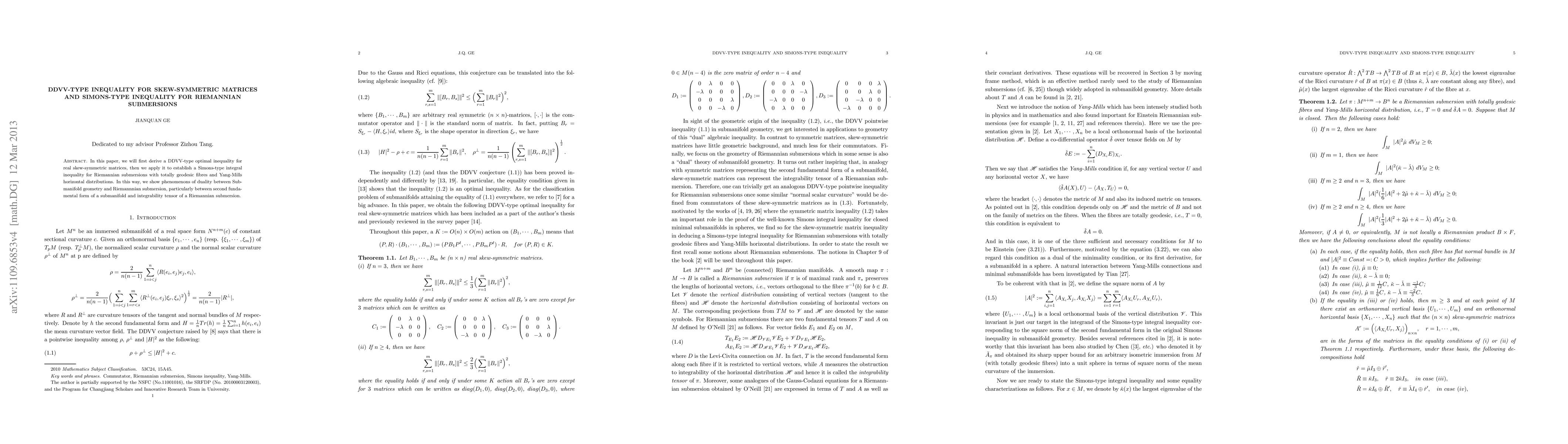This paper derives a DDVV-type inequality for real skew-symmetric matrices and applies it to establish a Simons-type integral inequality for Riemannian submersions, demonstrating duality between submanifold geometry and Riemannian submersion structures.
