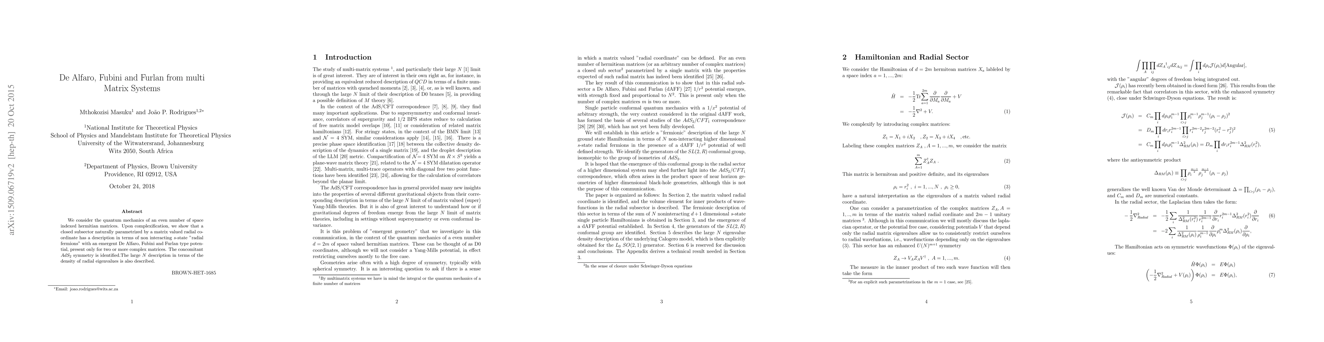 We consider the quantum mechanics of an even number of space indexed hermitian matrices. Upon complexification, we show that a closed subsector naturally parametrized by a matrix valued radial coordinate has a description in terms of non interacting $s$-state "radial fermions" with an emergent De Alfaro, Fubini and Furlan type potential, present only for two or more complex matrices. The concomitant $AdS_2$ symmetry is identified. The large $N$ description in terms of the density of radial eigenvalues is also described.
