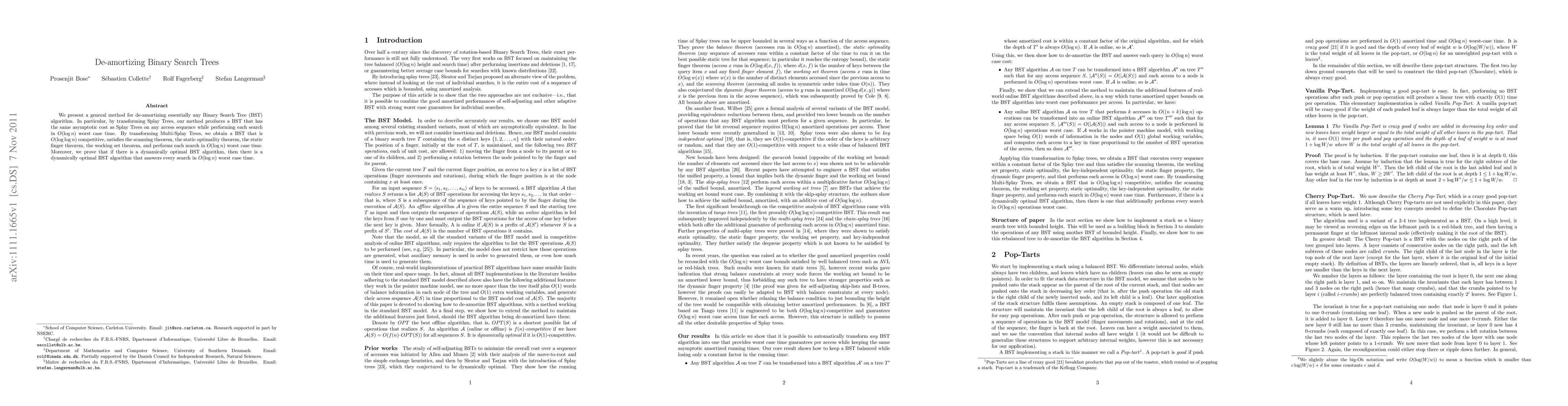 This paper introduces a method for de-amortizing Binary Search Trees (BSTs) by transforming Splay Trees and Multi-Splay Trees, achieving O(log n) worst-case search time and maintaining competitive performance metrics. It also proves the existence of dynamically optimal BST algorithms that answer searches in O(log n) time.