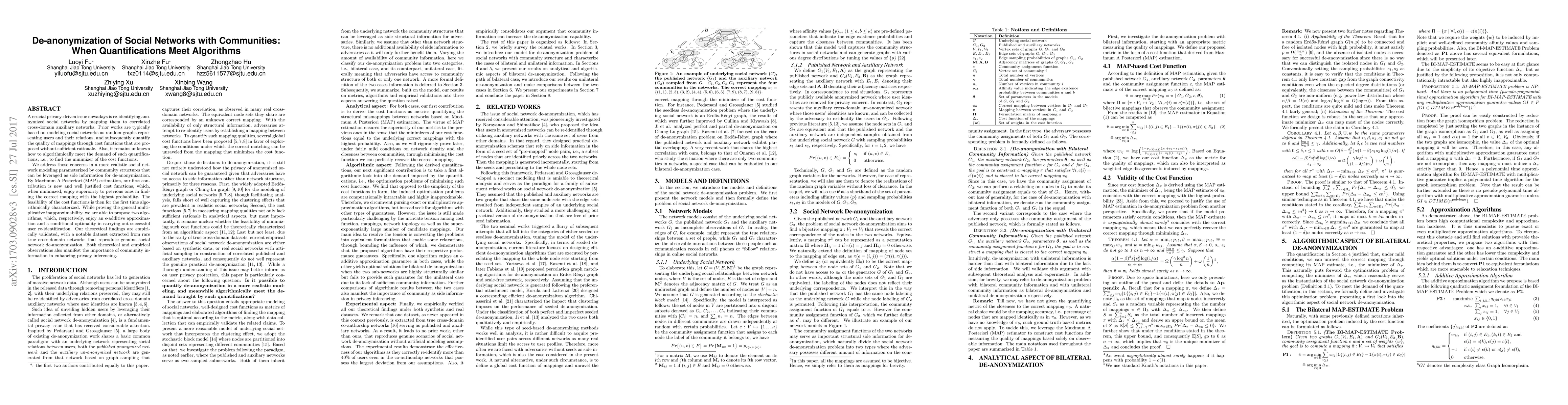 This paper addresses the issue of re-identifying anonymized social networks using auxiliary data, proposing new cost functions justified by community structures. It introduces algorithms that provide \epsilon-additive approximation and conditional optimality for de-anonymization, validated through empirical testing on real datasets.