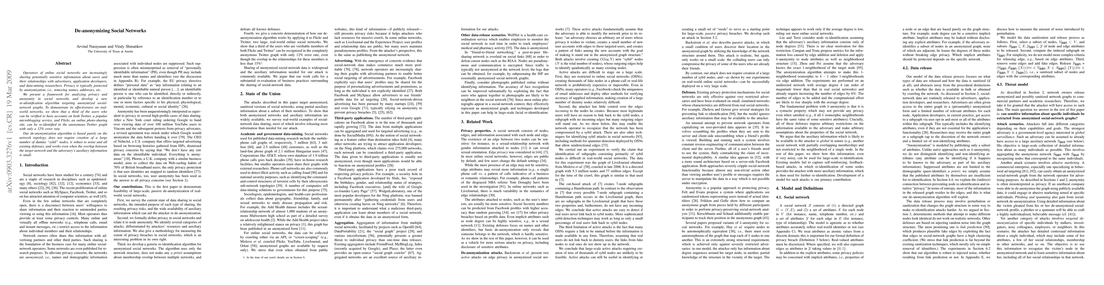 This paper presents a framework for assessing privacy in social networks and introduces a novel re-identification algorithm that can de-anonymize users in anonymized social-network graphs. The algorithm, which relies solely on network topology, successfully re-identifies a third of verified users from Twitter and Flickr with a 12% error rate, demonstrating its effectiveness despite existing defenses.