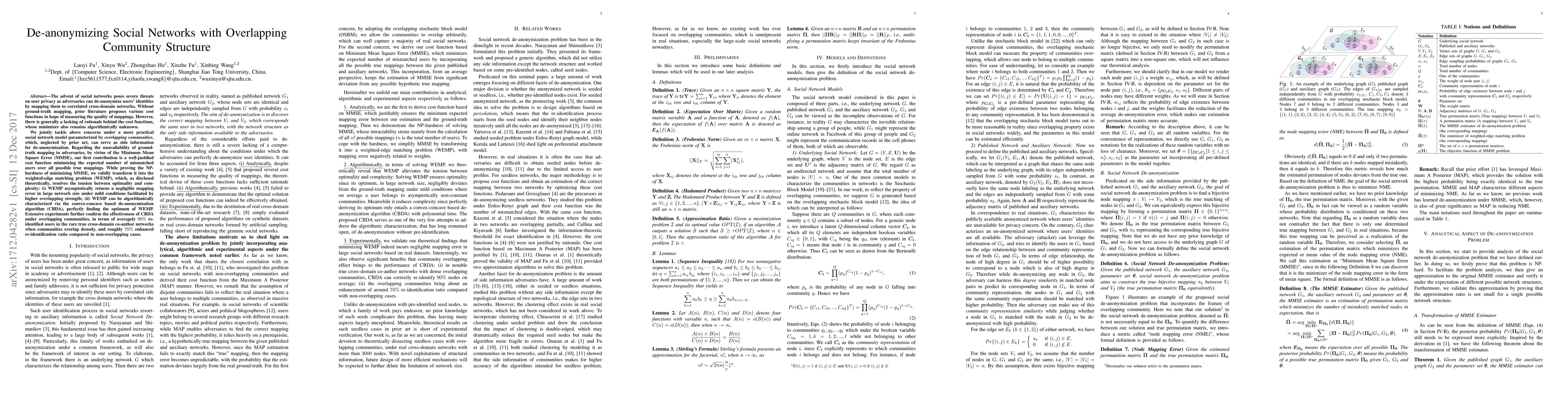 This paper addresses the issue of de-anonymizing users in social networks through mapping to correlated cross-domain networks, proposing a novel cost function based on Minimum Mean Square Error (MMSE) to minimize mismatched users. The authors introduce the weighted-edge matching problem (WEMP) to tackle this issue, demonstrating its effectiveness in resolving the tension between optimality and complexity, especially under dense overlapping community structures.