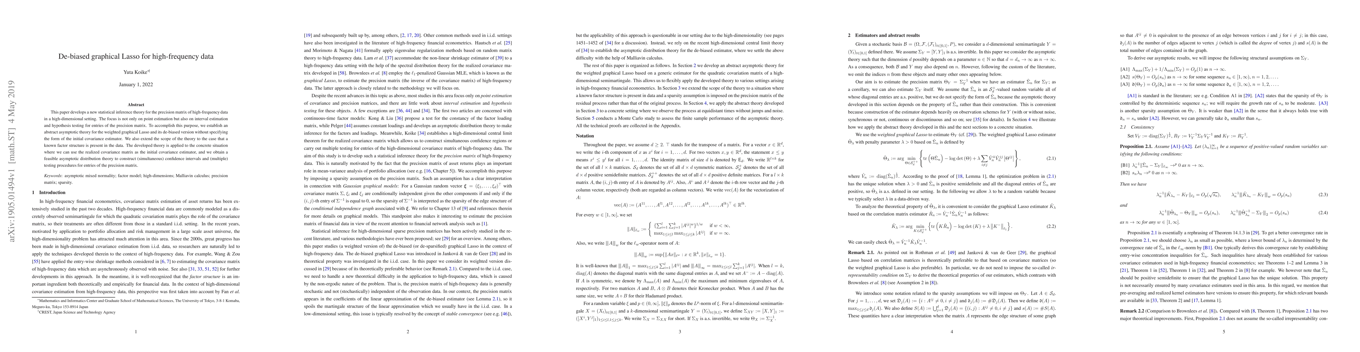 This paper develops a new statistical inference theory for the precision matrix of high-frequency data in a high-dimensional setting. The focus is not only on point estimation but also on interval estimation and hypothesis testing for entries of the precision matrix. To accomplish this purpose, we establish an abstract asymptotic theory for the weighted graphical Lasso and its de-biased version without specifying the form of the initial covariance estimator. We also extend the scope of the theory to the case that a known factor structure is present in the data. The developed theory is applied to the concrete situation where we can use the realized covariance matrix as the initial covariance estimator, and we obtain a feasible asymptotic distribution theory to construct (simultaneous) confidence intervals and (multiple) testing procedures for entries of the precision matrix.