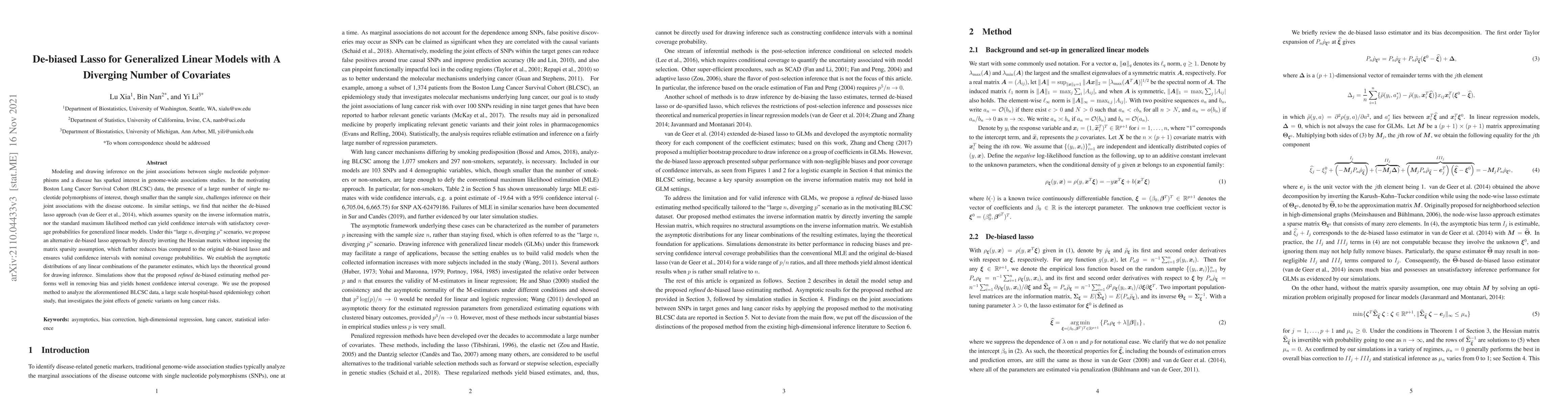 This paper proposes a refined de-biased lasso method for generalized linear models in scenarios with a large number of covariates relative to the sample size. The new approach directly inverts the Hessian matrix without sparsity assumptions, reducing bias and ensuring valid confidence intervals, as demonstrated through simulations and an analysis of the Boston Lung Cancer Survival Cohort data.