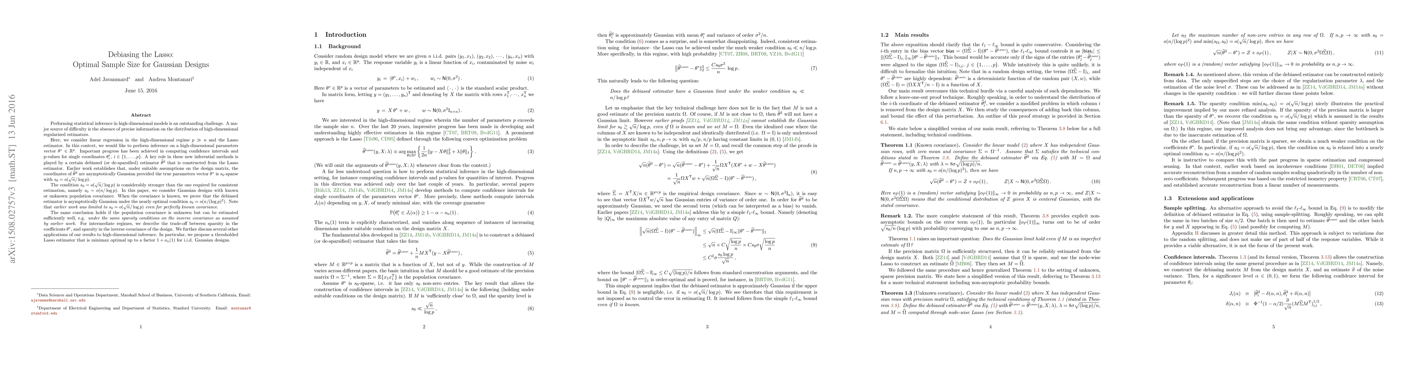 Performing statistical inference in high-dimension is an outstanding challenge. A major source of difficulty is the absence of precise information on the distribution of high-dimensional estimators. Here, we consider linear regression in the high-dimensional regime $p\gg n$. In this context, we would like to perform inference on a high-dimensional parameters vector $\theta^*\in{\mathbb R}^p$. Important progress has been achieved in computing confidence intervals for single coordinates $\theta^*_i$. A key role in these new methods is played by a certain debiased estimator $\hat{\theta}^{\rm d}$ that is constructed from the Lasso. Earlier work establishes that, under suitable assumptions on the design matrix, the coordinates of $\hat{\theta}^{\rm d}$ are asymptotically Gaussian provided $\theta^*$ is $s_0$-sparse with $s_0 = o(\sqrt{n}/\log p )$. The condition $s_0 = o(\sqrt{n}/ \log p )$ is stronger than the one for consistent estimation, namely $s_0 = o(n/ \log p)$. We study Gaussian designs with known or unknown population covariance. When the covariance is known, we prove that the debiased estimator is asymptotically Gaussian under the nearly optimal condition $s_0 = o(n/ (\log p)^2)$. Note that earlier work was limited to $s_0 = o(\sqrt{n}/\log p)$ even for perfectly known covariance. The same conclusion holds if the population covariance is unknown but can be estimated sufficiently well, e.g. under the same sparsity conditions on the inverse covariance as assumed by earlier work. For intermediate regimes, we describe the trade-off between sparsity in the coefficients and in the inverse covariance of the design. We further discuss several applications of our results to high-dimensional inference. In particular, we propose a new estimator that is minimax optimal up to a factor $1+o_n(1)$ for i.i.d. Gaussian designs.