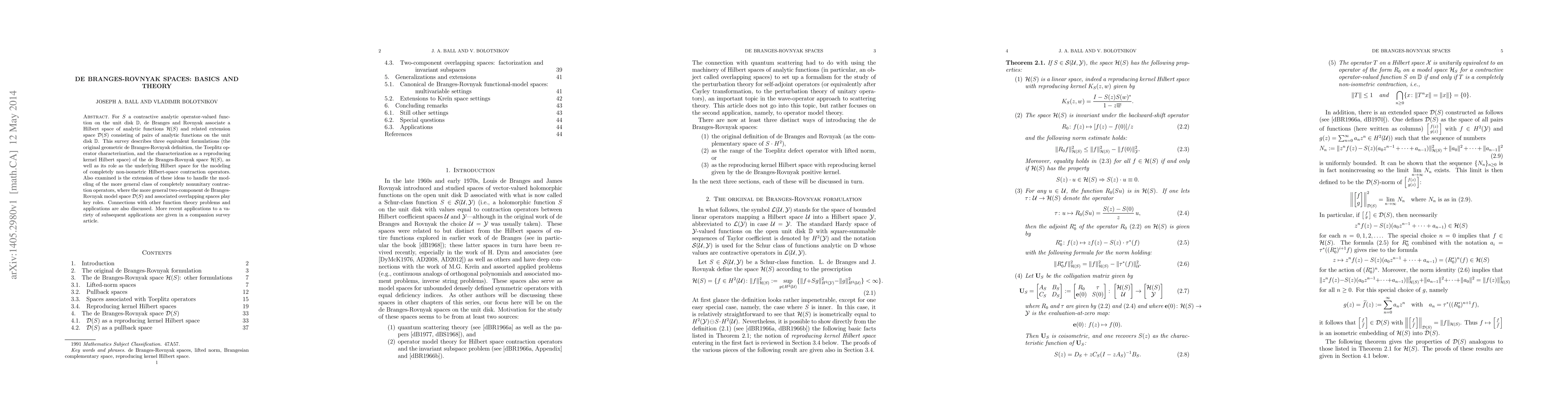 For $S$ a contractive analytic operator-valued function on the unit disk ${\mathbb D}$, de Branges and Rovnyak associate a Hilbert space of analytic functions ${\mathcal H}(S)$ and related extension space ${\mathcal D(S)}$ consisting of pairs of analytic functions on the unit disk ${\mathbb D}$. This survey describes three equivalent formulations (the original geometric de Branges-Rovnyak definition, the Toeplitz operator characterization, and the characterization as a reproducing kernel Hilbert space) of the de Branges-Rovnyak space ${\mathcal H}(S)$, as well as its role as the underlying Hilbert space for the modeling of completely non-isometric Hilbert-space contraction operators. Also examined is the extension of these ideas to handle the modeling of the more general class of completely nonunitary contraction operators, where the more general two-component de Branges-Rovnyak model space ${\mathcal D}(S)$ and associated overlapping spaces play key roles. Connections with other function theory problems and applications are also discussed. More recent applications to a variety of subsequent applications are given in a companion survey article.