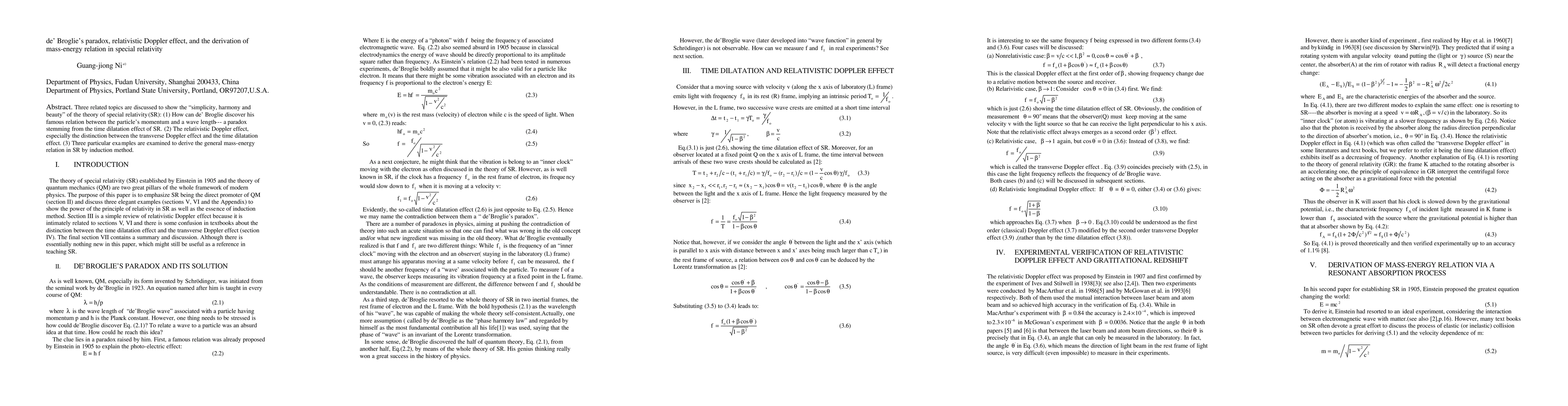 This paper explores how special relativity resolves de Broglie's paradox and derives the mass-energy relation through examples of the relativistic Doppler effect.