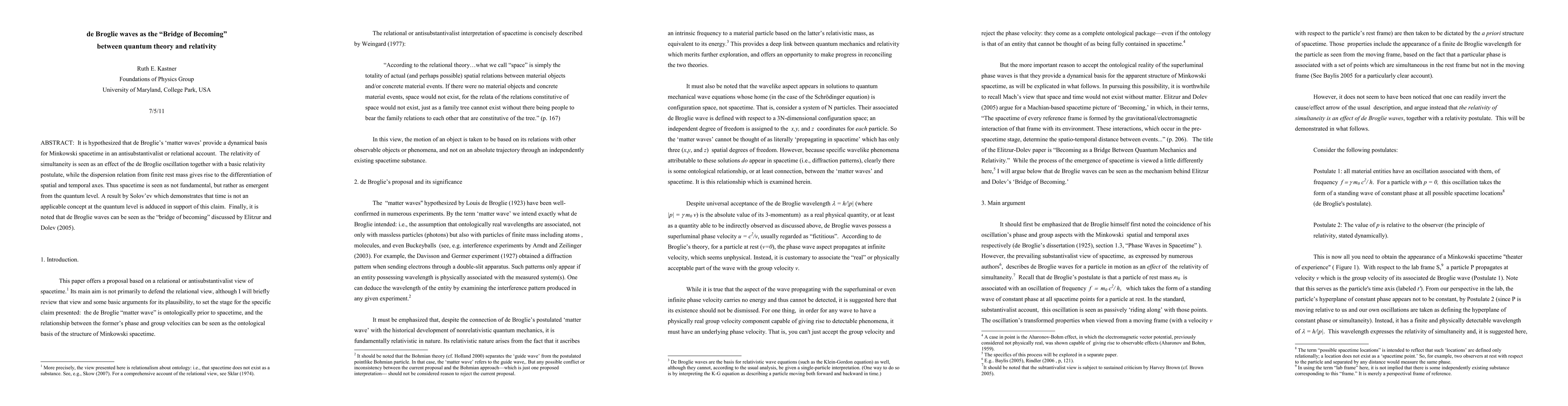 It is hypothesized that de Broglie's 'matter waves' provide a dynamical basis for Minkowski spacetime in an antisubstantivalist or relational account. The relativity of simultaneity is seen as an effect of the de Broglie oscillation together with a basic relativity postulate, while the dispersion relation from finite rest mass gives rise to the differentiation of spatial and temporal axes. Thus spacetime is seen as not fundamental, but rather as emergent from the quantum level. A result by Solov'ev which demonstrates that time is not an applicable concept at the quantum level is adduced in support of this claim. Finally, it is noted that de Broglie waves can be seen as the "bridge of becoming" discussed by Elitzur and Dolev (2005).