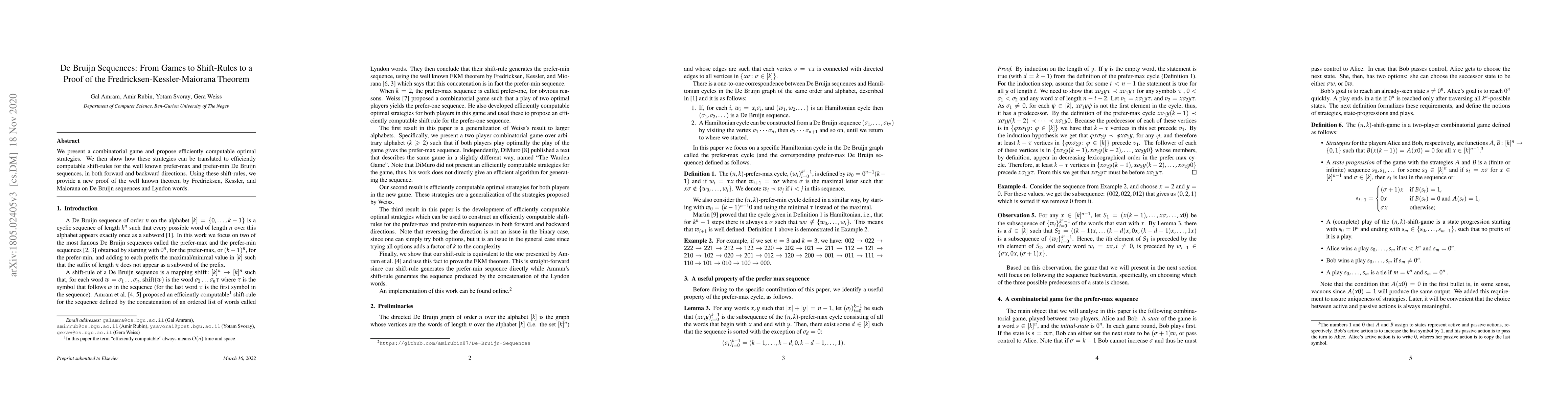 We present a combinatorial game and propose efficiently computable optimal strategies. We then show how these strategies can be translated to efficiently computable shift-rules for the well known prefer-max and prefer-min De Bruijn sequences, in both forward and backward directions. Using these shift-rules, we provide a new proof of the well known theorem by Fredricksen, Kessler, and Maiorana on De Bruijn sequences and Lyndon words.