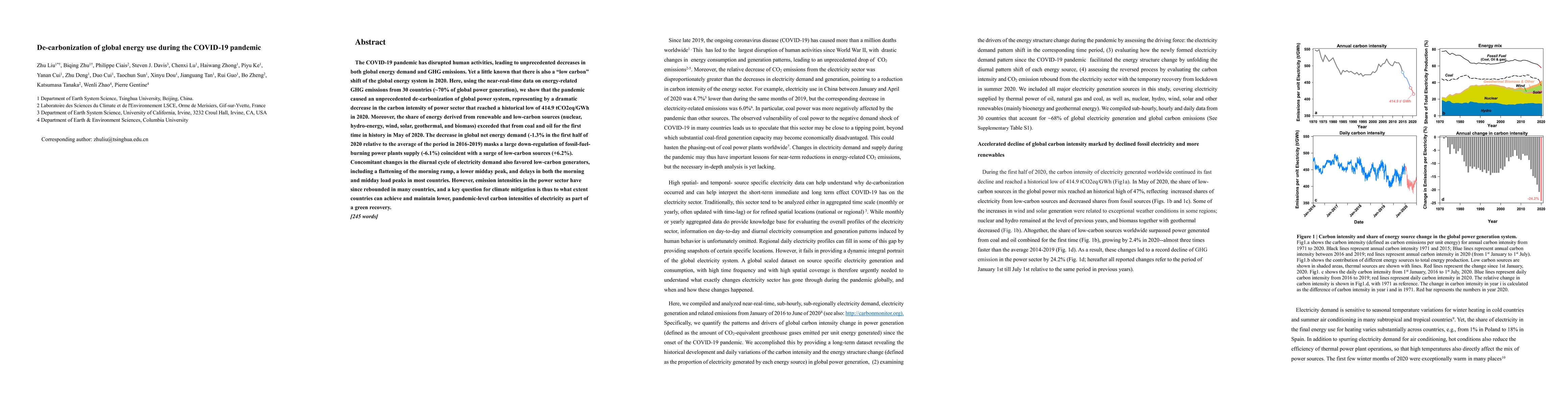 The COVID-19 pandemic led to a dramatic decrease in global energy demand and a historic low in carbon intensity of the power sector in 2020, with renewable and low-carbon sources surpassing fossil fuels for the first time. However, post-pandemic recovery has seen emission intensities rebound, raising questions about sustaining lower carbon intensities in the future.