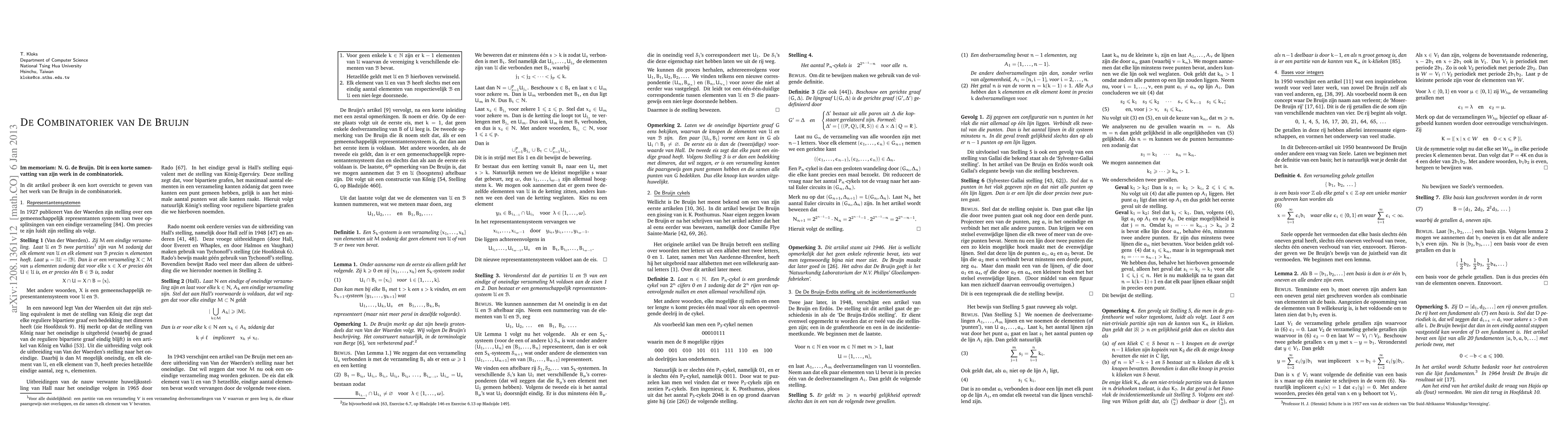 In memoriam N.G. de Bruijn. In this article I present some highlights of De Bruijn's contributions in combinatorics. This article does not survey his work on eg Penrose tilings, asymptotics or AUTOMATH; other surveys on these topics are being written by others.