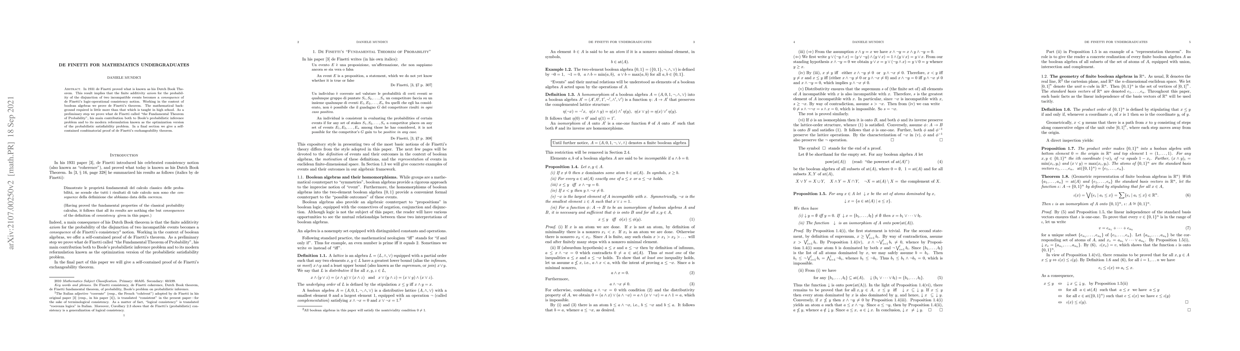 In 1931 de Finetti proved what is known as his Dutch Book Theorem. This result implies that the finite additivity {\it axiom} for the probability of the disjunction of two incompatible events becomes a {\it consequence} of de Finetti's logic-operational consistency notion. Working in the context of boolean algebras, we prove de Finetti's theorem. The mathematical background required is little more than that which is taught in high school. As a preliminary step we prove what de Finetti called ``the Fundamental Theorem of Probability'', his main contribution both to Boole's probabilistic inference problem on the object of probability theory, and to its modern reformulation known as the optimization version of the probabilistic satisfiability problem. In a final section, we give a self-contained combinatorial proof of de Finetti's exchangeability theorem.