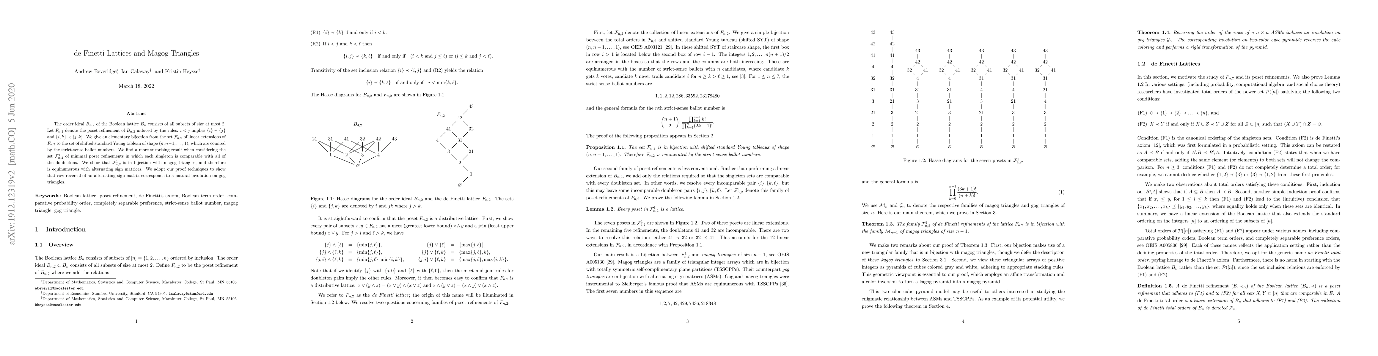 The order ideal $B_{n,2}$ of the Boolean lattice $B_n$ consists of all subsets of size at most $2$. Let $F_{n,2}$ denote the poset refinement of $B_{n,2}$ induced by the rules: $i < j$ implies $\{i \} \prec \{ j \}$ and $\{i,k \} \prec \{j,k\}$. We give an elementary bijection from the set $\mathcal{F}_{n,2}$ of linear extensions of $F_{n,2}$ to the set of shifted standard Young tableau of shape $(n, n-1, \ldots, 1)$, which are counted by the strict-sense ballot numbers. We find a more surprising result when considering the set $\mathcal{F}_{n,2}^{1}$ of minimal poset refinements in which each singleton is comparable with all of the doubletons. We show that $\mathcal{F}_{n,2}^{1}$ is in bijection with magog triangles, and therefore is equinumerous with alternating sign matrices. We adopt our proof techniques to show that row reversal of an alternating sign matrix corresponds to a natural involution on gog triangles.