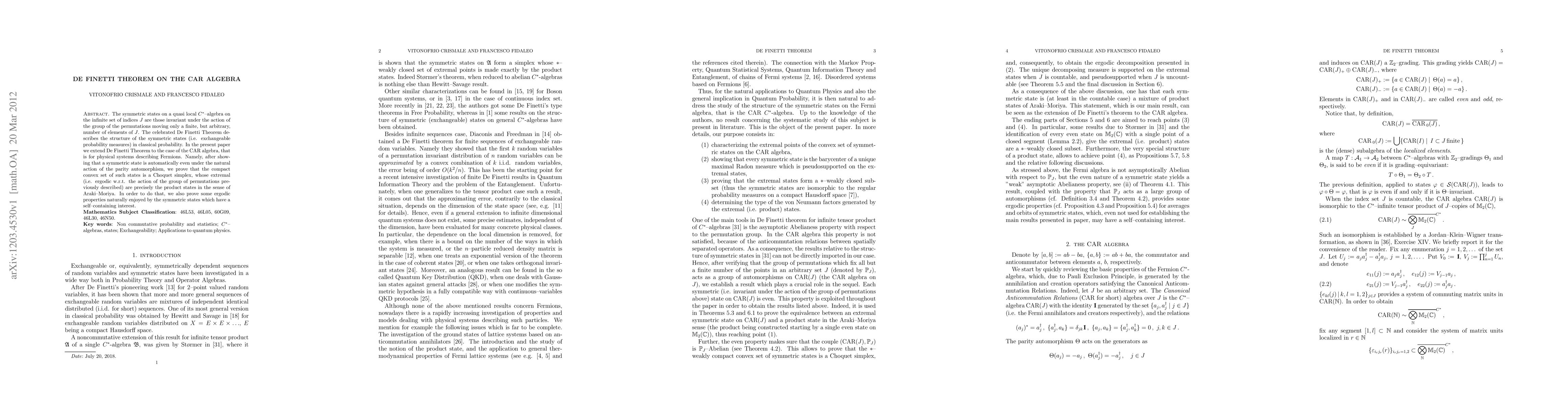 This paper extends De Finetti's theorem to the CAR algebra, showing that symmetric states on the algebra are automatically even and form a Choquet simplex. The extremal points of this set correspond to product states in the Araki-Moriya sense, thus linking classical exchangeability to fermionic quantum systems.