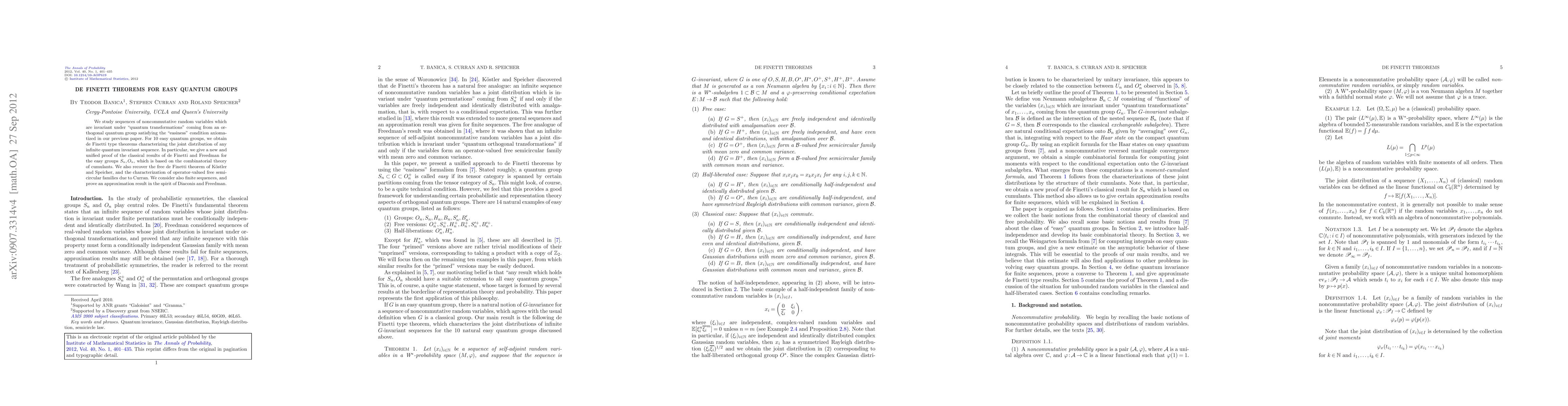 This paper explores sequences of noncommutative random variables invariant under quantum transformations from easy quantum groups, proving de Finetti theorems for these groups. The study provides a unified proof for classical results using combinatorial theory and extends to operator-valued free semicircular families.