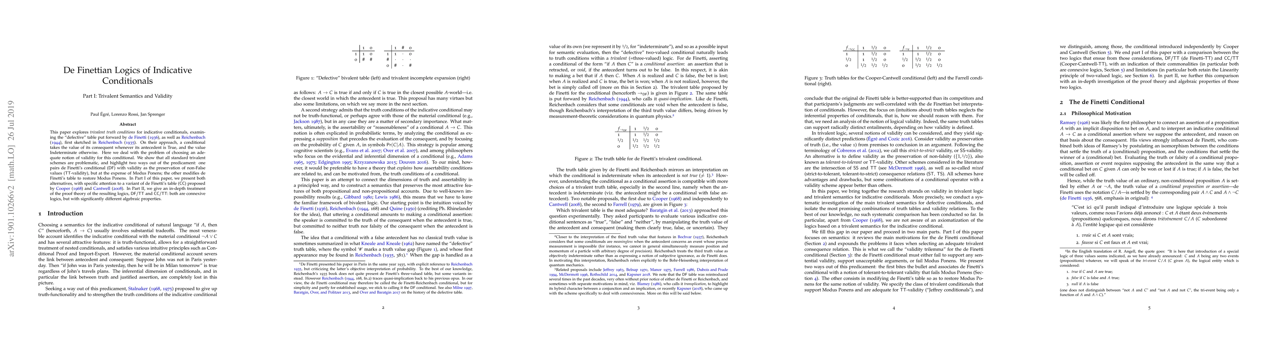 This paper examines trivalent truth conditions for indicative conditionals based on de Finetti's "defective" truth table, presenting two solutions to the problem of validity: one using TT-validity with non-False value preservation and another by modifying de Finetti's table to retain Modus Ponens. It explores the proof theory of the resulting logics, DF/TT and CC/TT, highlighting their differing algebraic properties.