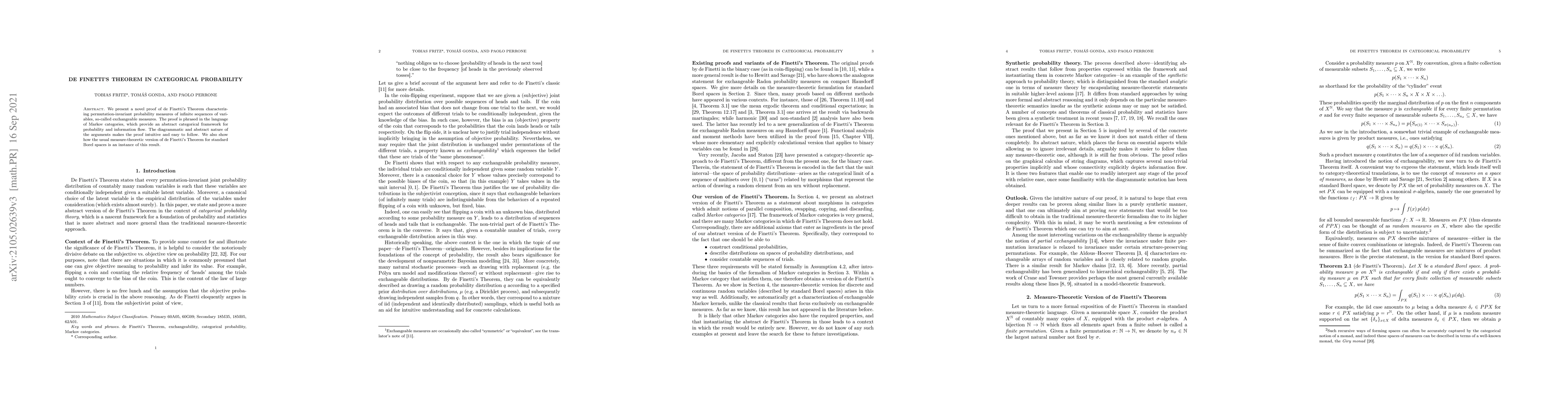 This paper presents a novel proof of de Finetti's Theorem using Markov categories for characterizing permutation-invariant probability measures of infinite sequences, termed exchangeable measures, and demonstrates its equivalence to the measure-theoretic version.