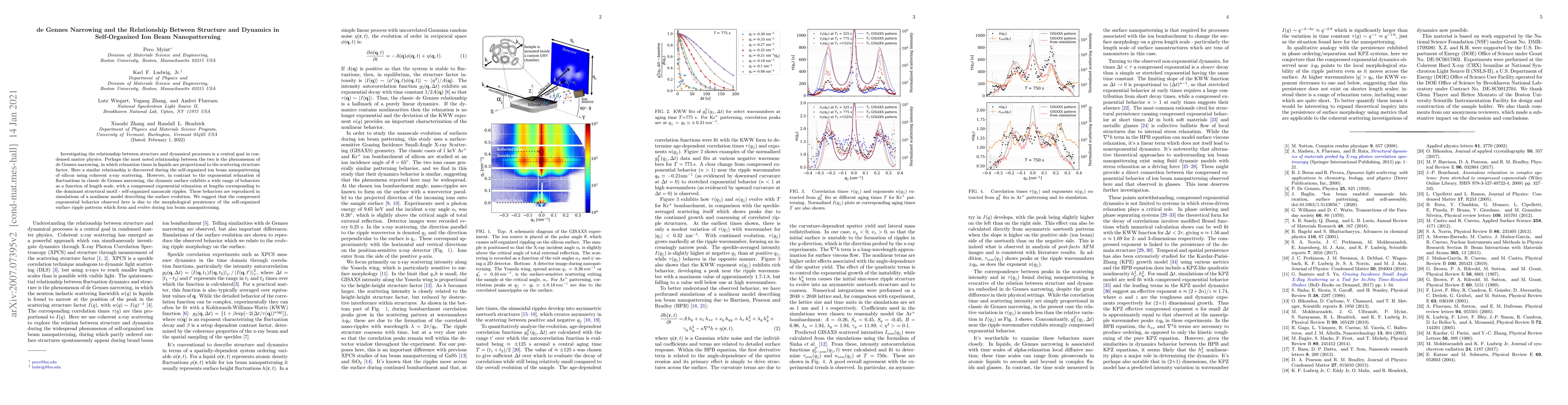 Investigating the relationship between structure and dynamical processes is a central goal in condensed matter physics. Perhaps the most noted relationship between the two is the phenomenon of de Gennes narrowing, in which relaxation times in liquids are proportional to the scattering structure factor. Here a similar relationship is discovered during the self-organized ion beam nanopatterning of silicon using coherent x-ray scattering. However, in contrast to the exponential relaxation of fluctuations in classic de Gennes narrowing, the dynamic surface exhibits a wide range of behaviors as a function of length scale, with a compressed exponential relaxation at lengths corresponding to the dominant structural motif - self-organized nanoscale ripples. These behaviors are reproduced in simulations of a nonlinear model describing the surface evolution. We suggest that the compressed exponential behavior observed here is due to the morphological persistence of the self-organized surface ripple patterns which form and evolve during ion beam nanopatterning.
