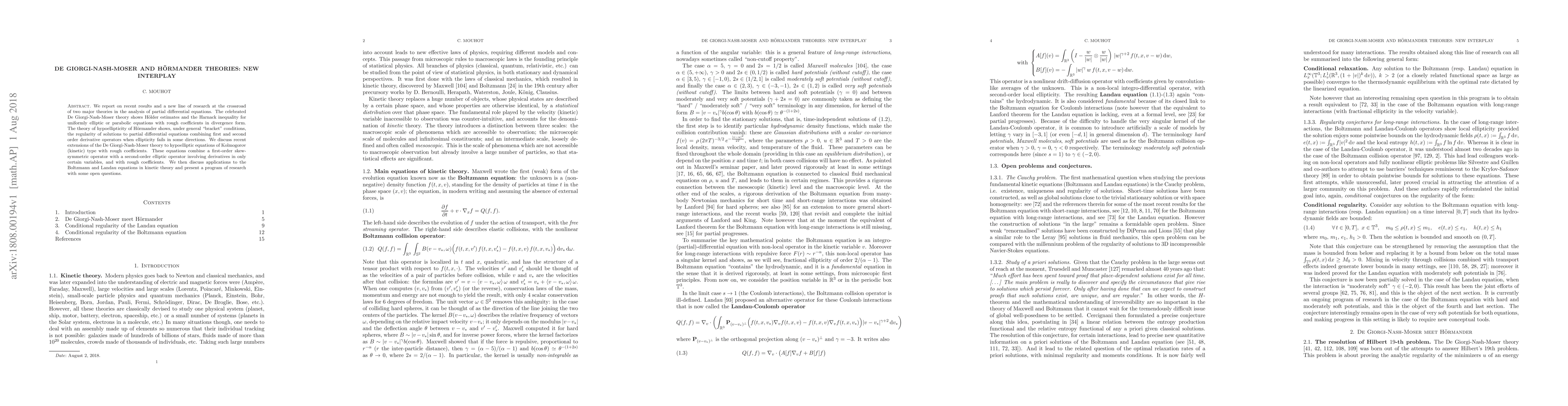 We report on recent results and a new line of research at the crossroad of two major theories in the analysis of partial differential equations. The celebrated De Giorgi-Nash-Moser theory shows H{\"o}lder estimates and the Harnack inequality for uniformly elliptic or parabolic equations with rough coefficients in divergence form. The theory of hypoellipticity of H{\"o}rmander shows, under general "bracket" conditions, the regularity of solutions to partial differential equations combining first and second order derivative operators when ellipticity fails in some directions. We discuss recent extensions of the De Giorgi-Nash-Moser theory to hypoelliptic equations of Kolmogorov (kinetic) type with rough coefficients. These equations combine a first-order skew-symmetric operator with a second-order elliptic operator involving derivatives in only certain variables, and with rough coefficients. We then discuss applications to the Boltzmann and Landau equations in kinetic theory and present a program of research with some open questions.