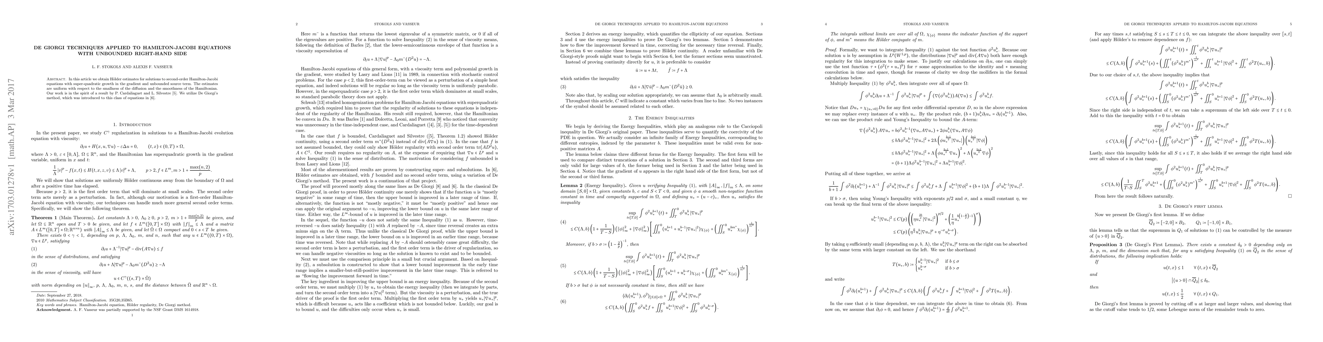 This paper provides Hölder estimates for solutions to Hamilton-Jacobi equations with super-quadratic gradient growth and unbounded sources, using De Giorgi techniques. The estimates are uniform with respect to diffusion and Hamiltonian smoothness.
