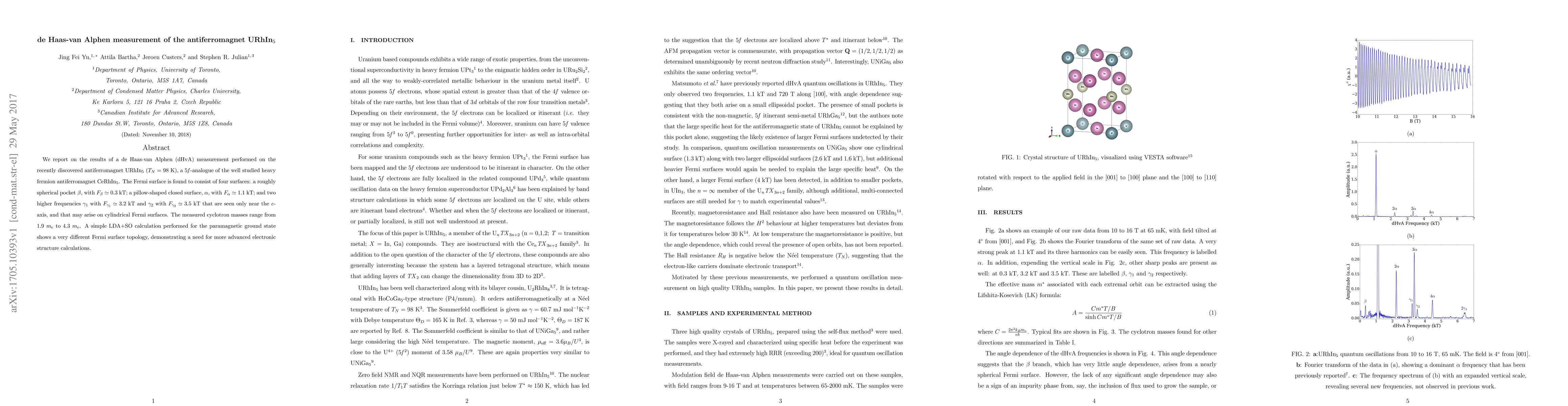 This study reports de Haas-van Alphen measurements on the antiferromagnet URhIn$_5$, revealing a Fermi surface consisting of four distinct surfaces, including a spherical pocket and two cylindrical-like surfaces near the c-axis. The cyclotron masses range from 1.9 to 4.3 times the electron mass, highlighting discrepancies between experimental findings and LDA+SO calculations.