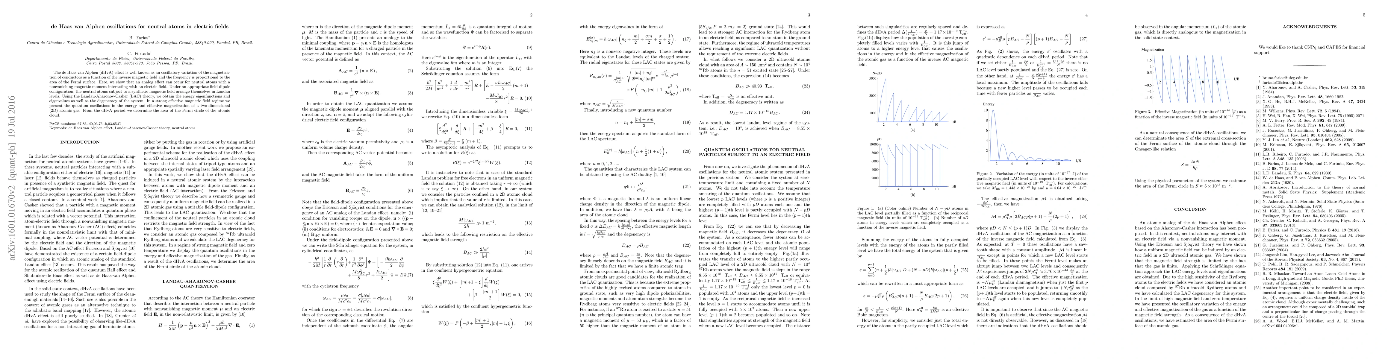 In this work we study the de Haas van Alfhen (dHvA) effect for neutral atoms with a nonvanishing magnetic moment interacting with an electric field. Considering the particles confined in a two dimensional (2D) atomic cloud and using the Landau-Aharonov-Casher (LAC) theory, we obtain the effective magnetic field as well as the energy eigenfunctions and eigenvalues of the system. Assuming the neutral atoms as being $ ^{87}\mathrm{Rb} $ ultracold Rydberg atoms we calculate the degeneracy of the energy levels. Under a strong effective magnetic field regime we present the quantum oscillations in the energy and effective magnetization of the atomic gas. From the dHvA period we determine the area of the Fermi circle of the atomic cloud.