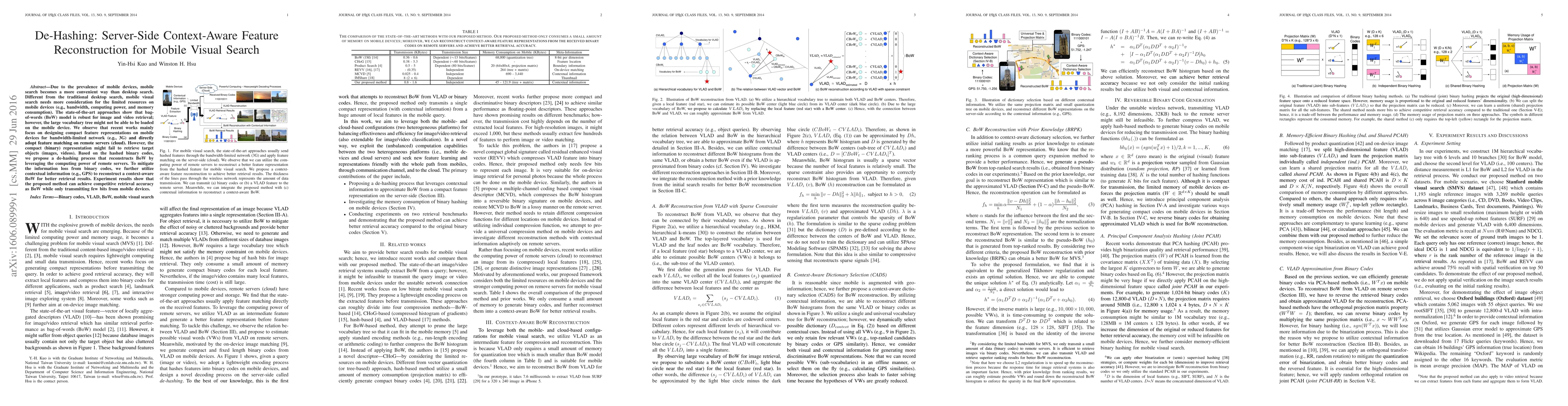 The paper proposes a de-hashing method for mobile visual search that reconstructs context-aware bag-of-words features on remote servers to mitigate information loss from compact binary representations, achieving competitive retrieval accuracy with minimal data transmission. Contextual information like GPS is used to enhance feature reconstruction.