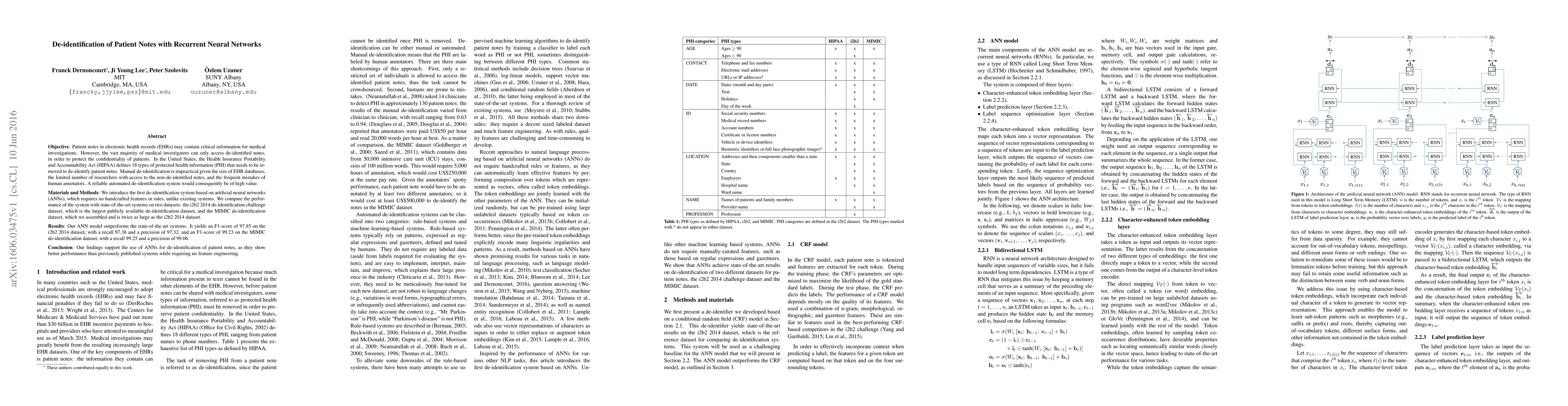 This paper introduces an artificial neural network (ANN)-based system for automated de-identification of patient notes in electronic health records, achieving superior performance compared to state-of-the-art methods on two datasets. The ANN model demonstrates high accuracy without the need for handcrafted features.