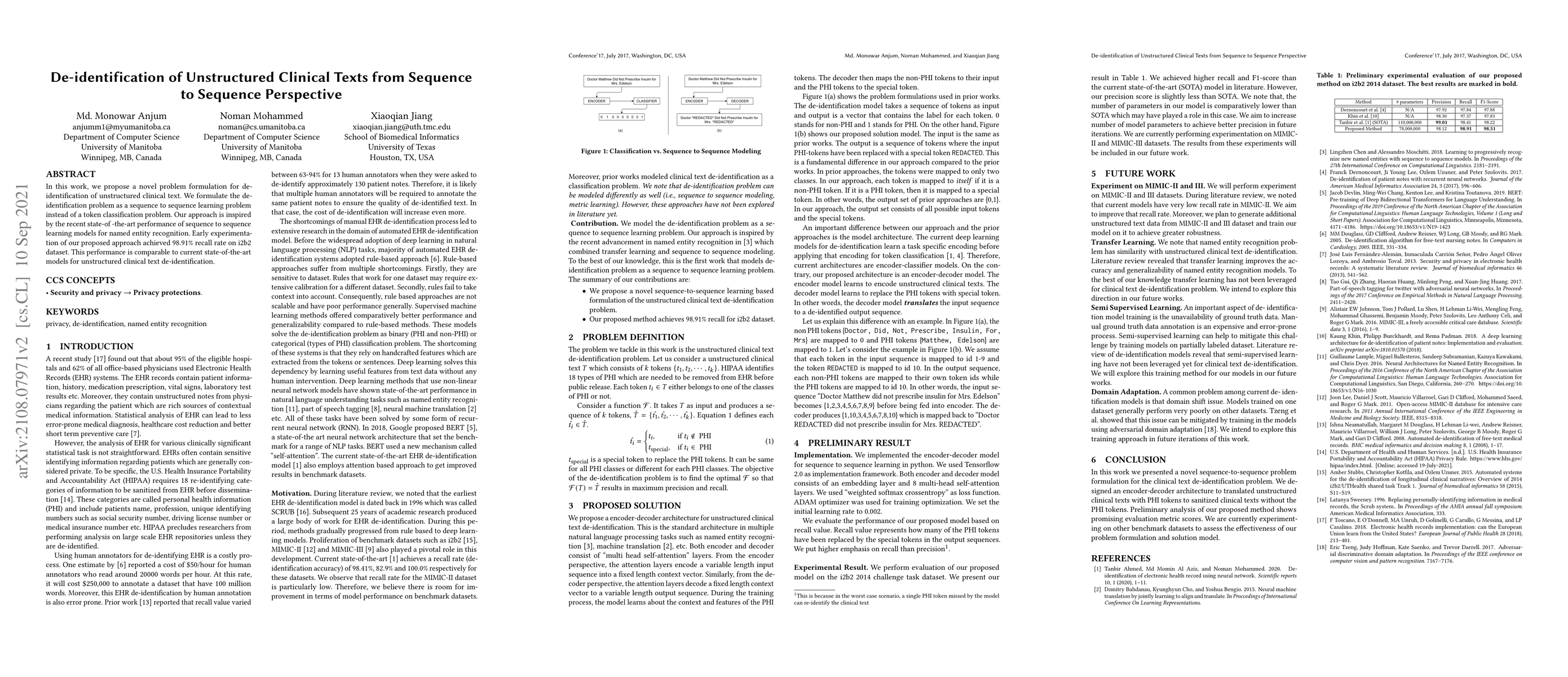 This paper proposes a sequence-to-sequence learning approach for de-identifying unstructured clinical texts, achieving a 98.91% recall rate on the i2b2 dataset, comparable to existing token classification methods. The new formulation aims to improve the state-of-the-art performance in this domain.