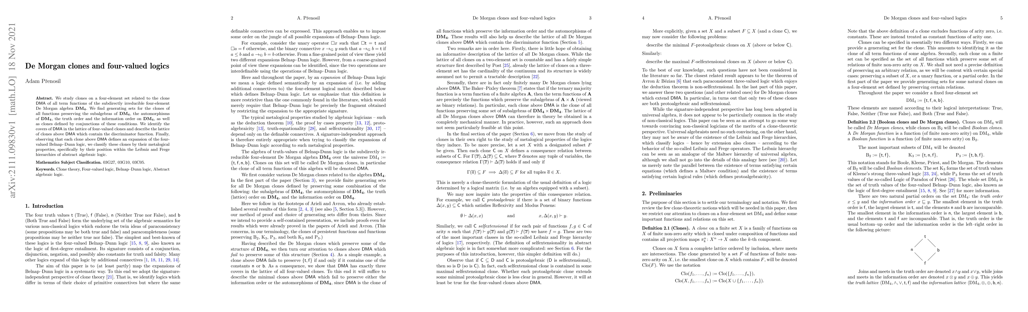 We study clones on a four-element set related to the clone $\mathsf{DMA}$ of all term functions of the sub\-directly irreducible four-element De~Morgan algebra $\mathbf{DM_{4}}$. We find generating sets for the clones of all functions preserving the subalgebras of $\mathbf{DM_{4}}$, the auto\-morphisms of~$\mathbf{DM_{4}}$, the truth order and the information order on $\mathbf{DM_{4}}$, as well as clones defined by conjunctions of these conditions. We identify the covers of $\mathsf{DMA}$ in the lattice of four-valued clones and describe the lattice of clones above $\mathsf{DMA}$ which contain the discriminator function. Finally, observing that each clone above $\mathsf{DMA}$ defines an expansion of the four-valued Belnap--Dunn logic, we classify these clones by their metalogical properties, specifically by their position within the Leibniz and Frege hierarchies of abstract algebraic logic.