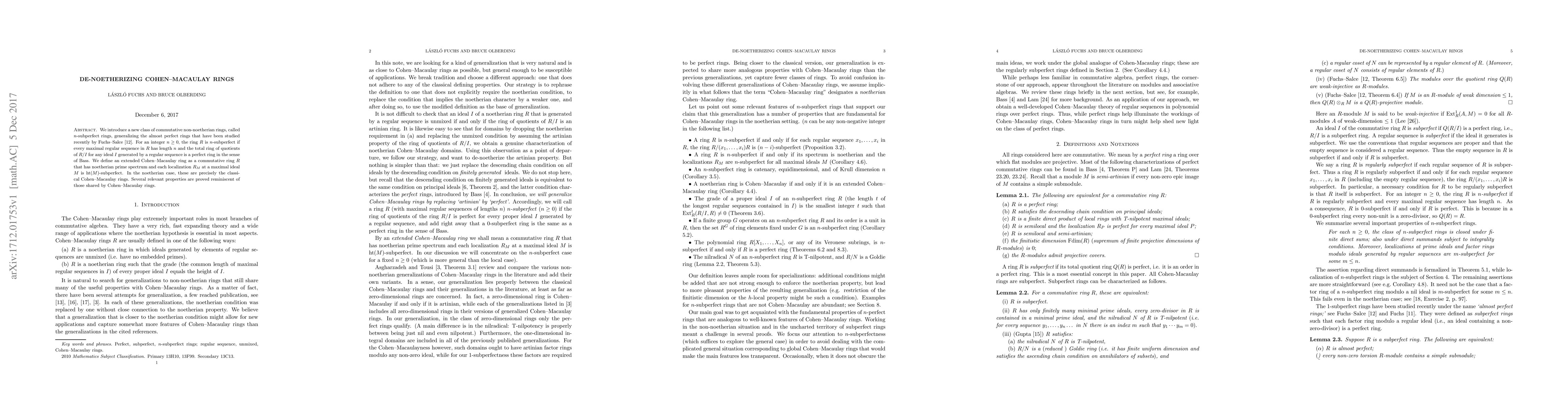 We introduce a new class of commutative {non-noetherian} rings, called $n$-subperfect rings, generalizing the almost perfect rings that have been studied recently by Fuchs-Salce. For an integer $n \ge 0$, the ring $R$ is $n$-subperfect if every maximal regular sequence in $R$ has length $n$ and the total ring of quotients of $R/I$ for any ideal $I$ generated by a regular sequence is a perfect ring in the sense of Bass. We define an extended Cohen-Macaulay ring as a commutative ring $R$ that has noetherian prime spectrum and each localization $R_M$ at a maximal ideal $M$ is ht($M$)-subperfect. In the noetherian case, these are precisely the classical Cohen-Macaulay rings. Several relevant properties are proved reminiscent of those shared by Cohen-Macaulay rings.