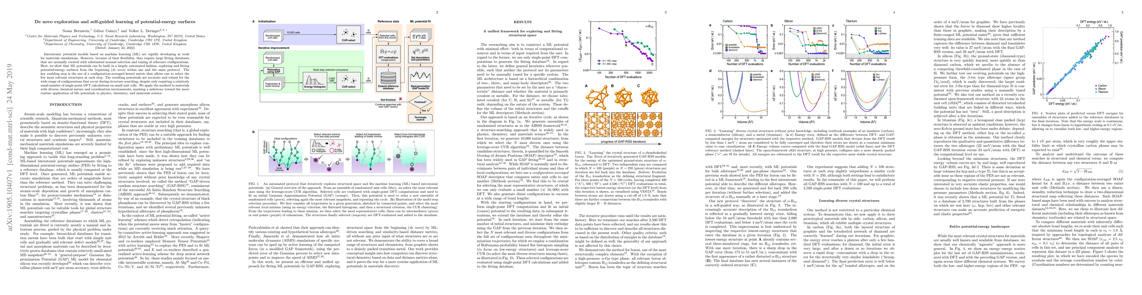 Interatomic potential models based on machine learning (ML) are rapidly developing as tools for materials simulations. However, because of their flexibility, they require large fitting databases that are normally created with substantial manual selection and tuning of reference configurations. Here, we show that ML potentials can be built in a largely automated fashion, exploring and fitting potential-energy surfaces from the beginning (de novo) within one and the same protocol. The key enabling step is the use of a configuration-averaged kernel metric that allows one to select the few most relevant structures at each step. The resulting potentials are accurate and robust for the wide range of configurations that occur during structure searching, despite only requiring a relatively small number of single-point DFT calculations on small unit cells. We apply the method to materials with diverse chemical nature and coordination environments, marking a milestone toward the more routine application of ML potentials in physics, chemistry, and materials science.