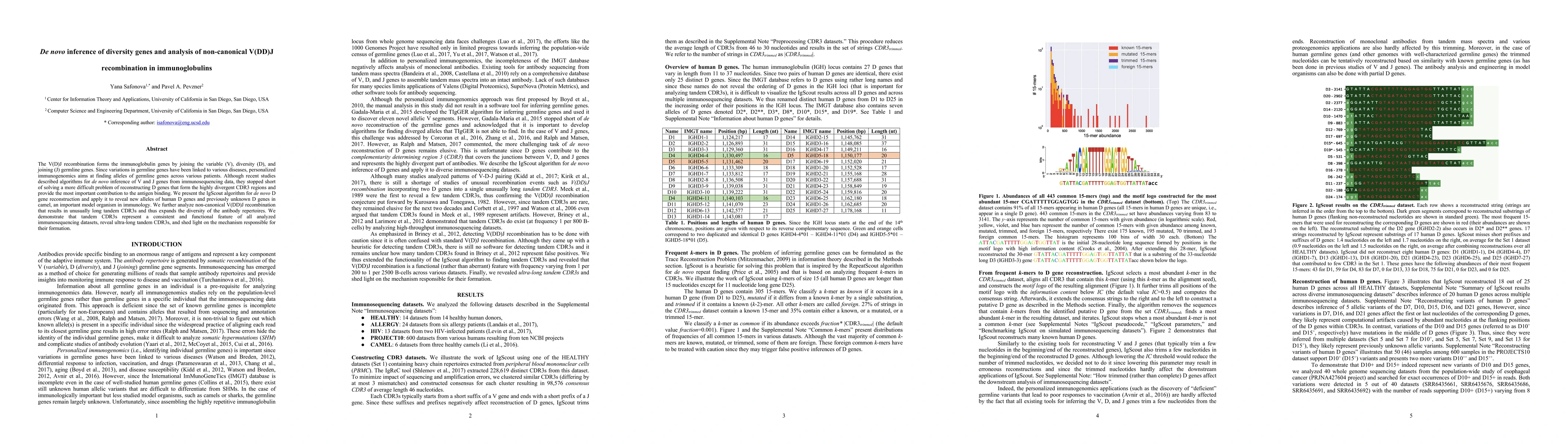 The paper introduces the IgScout algorithm for reconstructing diversity (D) genes in immunoglobulins, revealing new human D gene alleles and previously unknown camel D genes. It also investigates non-canonical V(DD)J recombination, showing that tandem CDR3s significantly expand antibody repertoire diversity and identifying the mechanisms behind their formation.