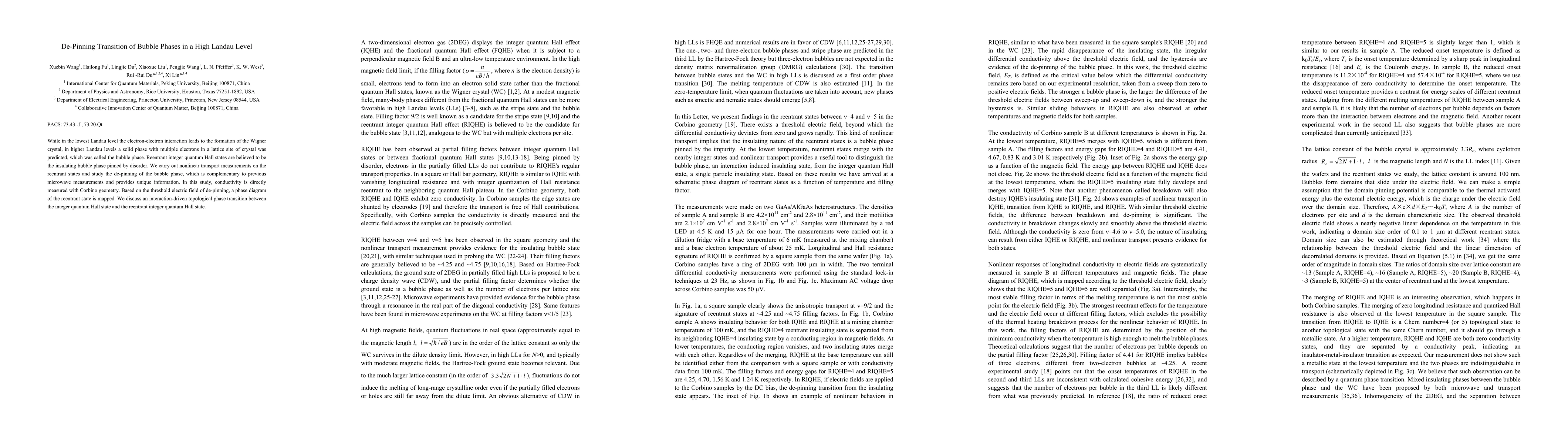 This paper investigates the de-pinning transition of bubble phases in high Landau levels through nonlinear transport measurements, revealing a topological phase transition between integer quantum Hall states and reentrant states. The study uses Corbino geometry to directly measure conductivity and maps a phase diagram based on the threshold electric field for de-pinning.