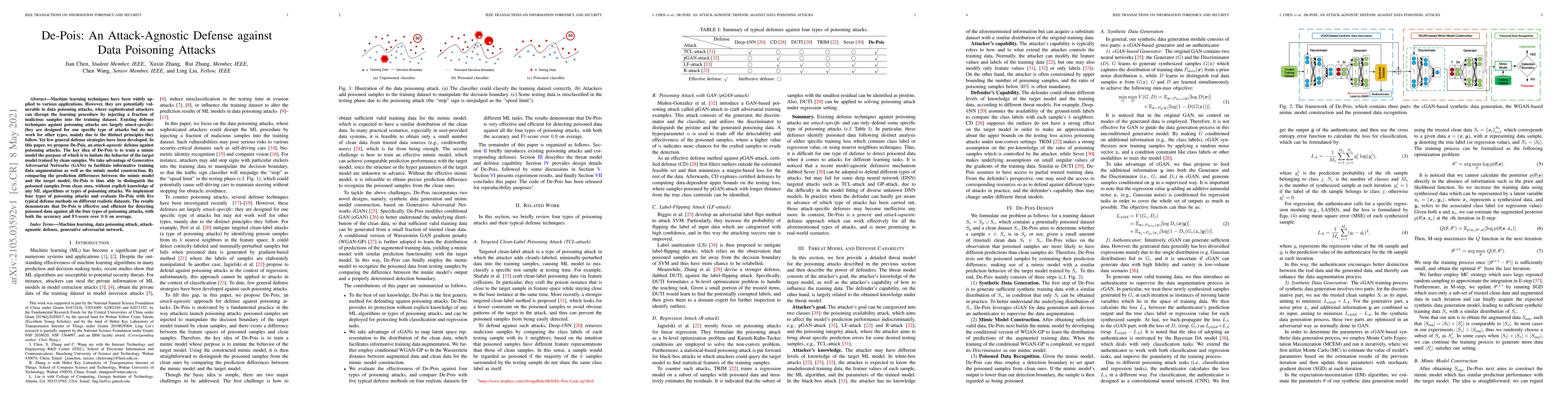 This paper introduces De-Pois, an attack-agnostic defense against data poisoning attacks in machine learning. De-Pois leverages Generative Adversarial Networks to train a mimic model that imitates the target model, enabling it to detect poisoned samples by comparing prediction differences, without needing specific knowledge of attack types.